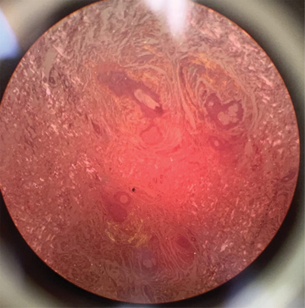 Se le realizó biopsia de la lesión localizada en hueco axilar, en la cual se observó queratosis seborreica reticulada y depósito perianexial focal de material amiloide. Tinción rojo Congo positivo (Figura 3), con lo que se consolida el diagnóstico de amiloidosis cutánea.