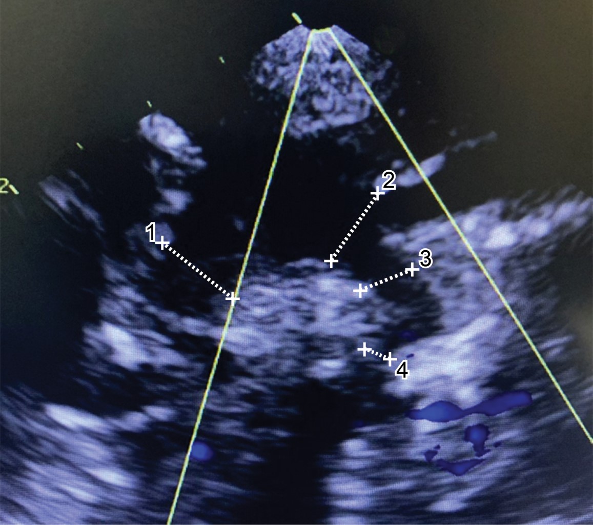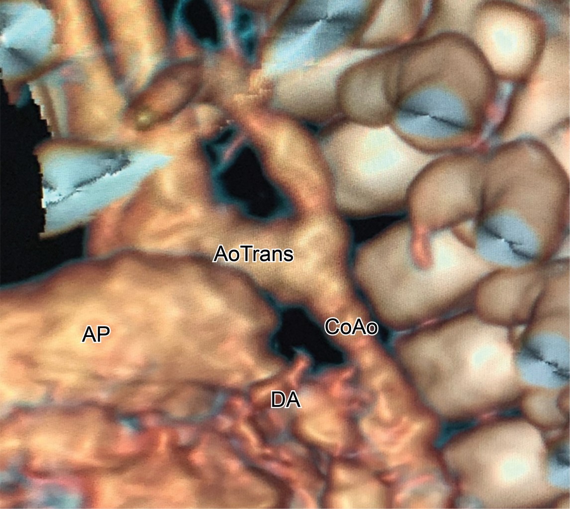 Presentamos el caso de un recién nacido de embarazo gemelar monocoriónico, producto de la cuarta gestación y nacimiento a las 35.2 semanas. La indicación de la cesárea fue por alteración en el crecimiento intrauterino del gemelo 2 (peso estimado por USG un día previo; gemelo 1: 2.4 kg, gemelo 2: 1.7 kg) y flujos placentarios normales. Se obtiene a recién nacido por cesárea, gemelo 2 con llanto vigoroso y esfuerzo respiratorio adecuado. Valoración Apgar 8-8, peso 1,700 gramos, escala de Silverman 2 y frecuencia respiratoria de 65 respiraciones por minuto, manejado con oxígeno indirecto con casco cefálico a 40% y 5 L/min. Inicialmente asintomático con pulsos presentes las primeras 12 horas de vida extrauterina. Posteriormente muestra soplo sistólico en mesocardio con irradiación al dorso. Los pulsos arteriales se encontraban presentes en las cuatro extremidades, aunque los femorales discrepan de los radiales en intensidad y amplitud. El ecocardiograma inicial mostró coartación aórtica crítica (CoAo) con gradiente medio de 52 mmHg, hipoplasia del arco aórtico y ductus arterioso permeable grande (Figura 1). El abordaje inicial fue la infusión de alprostadil (Alisitin 500®) a una dosis 0.1 µg/kg/min, retiro del aporte de oxígeno y solicitud de angiotomografía de aorta (previa valoración de una función renal normal) donde se confirma el diagnóstico con descripción de coartación aórtica con diámetros: ascendente 6 mm, transversal 5 mm, descendente 4 mm y zona de coartación 2 mm (Figura 2).