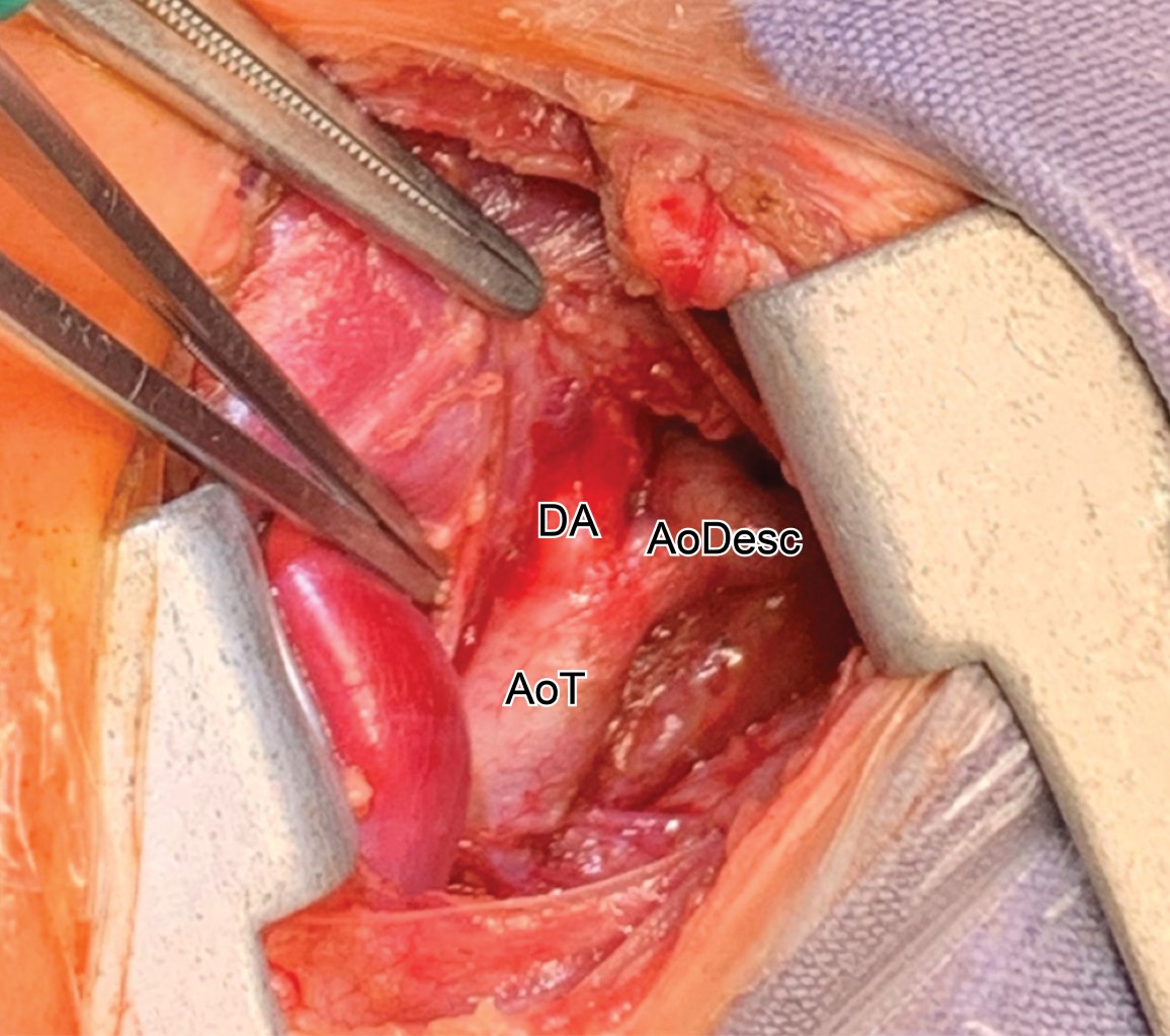Se decidió llevar a corrección quirúrgica urgente con las consideraciones de riesgo por edad y peso. Mediante abordaje por toracotomía lateral izquierda se realizó coartectomía ampliada, sección y sutura del ductus arterioso sin complicaciones (Figura 3).