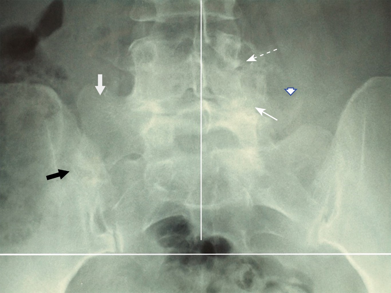 Paciente masculino de 33 años de edad con antecedentes de cuadros de lumbalgia moderada desde los 18 años de edad (de uno a tres cuadros por año, con duración de síntomas de menos de una semana por episodio); relata haber subido 7 kilos de peso en el último año, por lo que decidió someterse a programa de ejercicio en los dos últimos meses (trote de 5 kilómetros alternando con ejercicios aeróbicos en gimnasio). A los 10 días del inicio de ejercicio presentó lumbalgia con intensidad de 6 a 8 en EVA, con irradiación a nalga derecha y cara anterolateral de muslo izquierdo por arriba de rodilla que no respondió a antiinflamatorios habituales utilizados por el paciente (naproxeno 500 mg BID), por lo que acude a rehabilitación. A la exploración: marcha de características normales; postura: elevación discreta de hombro derecho, desnivel pélvico por acortamiento de miembro pélvico derecho, abdomen globoso por panículo adiposo e hiperlordosis lumbar. Dolor a la presión de músculos paravertebrales lumbares bilateral que se incrementa con movimientos de rotación, dolor a la presión de articulación sacroiliaca derecha, siendo positivos los signos de Patrick, Gaenslen y de Yeoman para sacroiliaca derecha y negativos para la izquierda; signo de Lasègue negativo bilateral, arcos de movimiento de extremidades pélvicas completos, examen clínico muscular indicando: abdominales 3/5, resto 5/5; sensibilidad, reflejos osteotendinosos, pulsos y llenado capilar normales. Con diagnóstico de síndrome facetario L4/L5 izquierdo y probable sacroileitis derecha. Se solicitaron radiografías simples anteroposterior y lateral de columna lumbosacra en bipedestación (Figura 1) encontrando: sacralización de la quinta vértebra lumbar con megaapófisis transversa derecha (flecha gris) al compararse con apófisis transversa izquierda de L5 (cabeza de flecha) formando pseudoarticulación con el ilion derecho (flecha negra) y artrosis facetaria L4/L5 izquierda (flecha blanca delgada), asociada con laterolistesis derecha del cuerpo de L4 (flecha punteada). Se estableció diagnóstico de síndrome de Bertolotti tipo IIA.