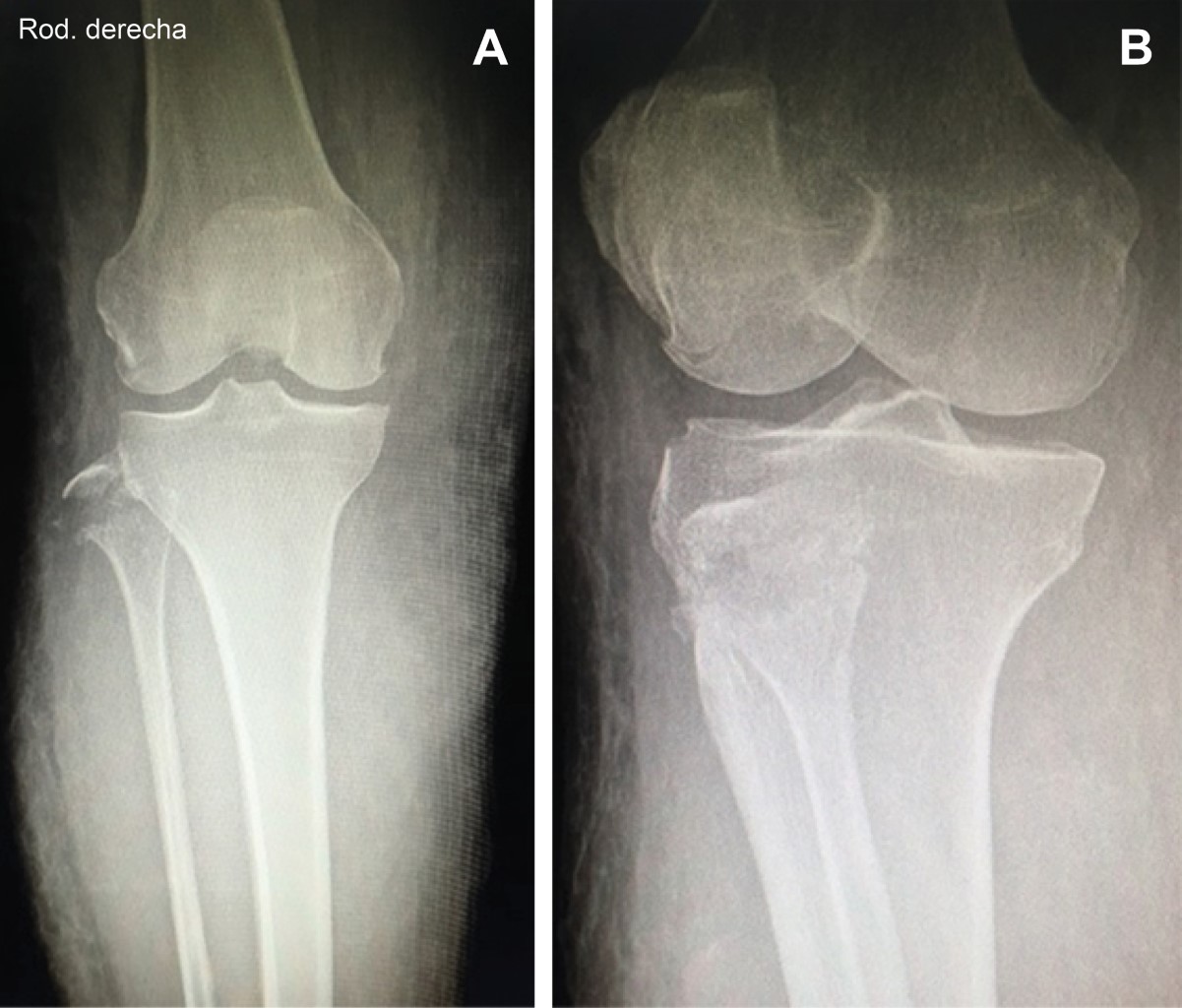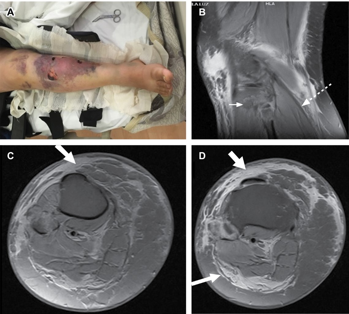 Paciente femenino de 49 años, sin antecedentes de importancia, que acude a urgencias por presentar dos horas antes de su arribo traumatismo directo sobre pierna derecha por automóvil, a la exploración: zona equimótica rodilla y cara anterointerna de pierna y tobillo, dolor intenso sobre cabeza de peroné, hipoestesia en territorio equimótico, al igual que en territorio cutáneo del nervio peroneo; sin datos de síndrome compartimental, pulsos y llenado capilar normales, con vendaje de Jones se hospitaliza y se solicitan radiografías (Figura 1) corroborando fractura de cabeza de peroné; al tercer día se presenta edema en pierna y presencia de flictenas, permaneciendo llenado capilar y pulsos presentes. Con el diagnóstico clínico de síndrome de Morel Lavallée se solicita resonancia magnética que lo confirma (Figura 2), la paciente presentó necrosis cutánea, que requirió de debridación y aseos quirúrgicos seriados, además de injerto de piel, reconstrucción del complejo posterolateral de rodilla con técnica de Larson modificado, liberación del nervio peroneo y rehabilitación prolongada.