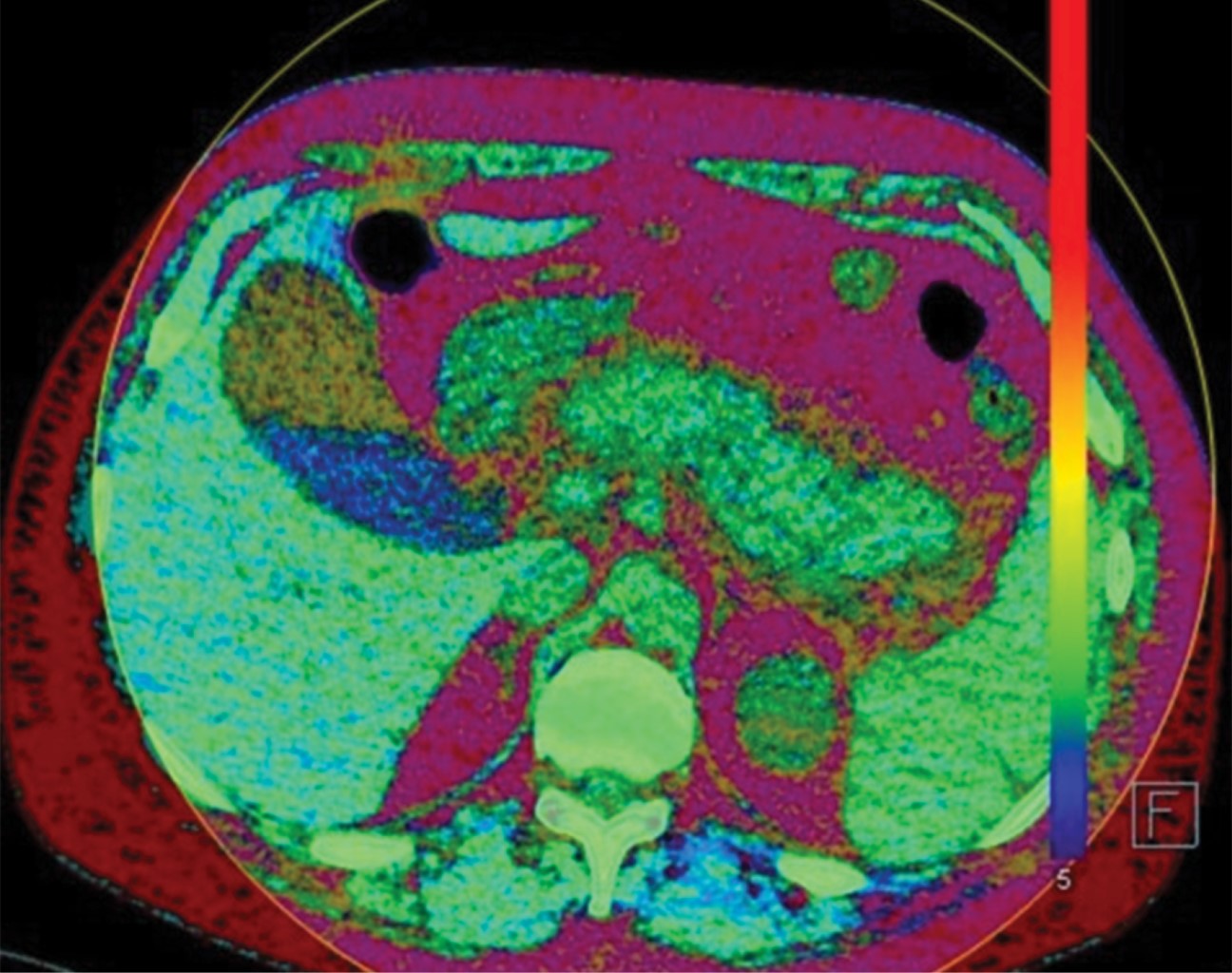 Masculino de 32 años de edad, sin antecedentes personales patológicos de importancia, acude al servicio de urgencias por presentar dolor abdominal transfictivo a nivel de epigastrio, acompañado de vómito de contenido alimenticio en dos ocasiones. Se solicitó estudio de tomografía abdominal por médico tratante, la cual se realizó con modalidad de energía dual, y definió múltiples imágenes redondeadas en vesícula biliar en relación a litiasis (Figura 1) así como aumento del volumen pancreático y estriación de la grasa adyacente compatible con pancreatitis Balthazar D (Figura 2).