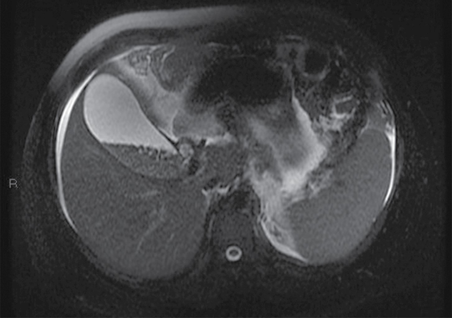 El estudio imagenológico de la litiasis vesicular tiene vital importancia en el manejo de los pacientes con abdomen agudo de los servicios de urgencias.3 La tomografía computarizada de abdomen ha sido establecida como una herramienta primordial de imagenología en el proceso diagnóstico en diversas patologías abdominales y como una herramienta con gran sensibilidad y especificidad en la valoración del abdomen agudo,5 aunque de forma inicial el ultrasonido continúa siendo el estudio de primera elección en pacientes con historia reciente de dolor de tipo biliar, con una especificidad superior a 95% para litos mayores de 2 mm.1,2 En la resonancia magnética la litiasis vesicular se observa mejor en imágenes contrastadas en T2 (Figura 3), e incluso puede ayudar a distinguir entre diferentes tipos de cálculos biliares, los de colesterol tienden a tener mayor intensidad en T1, mientras que los cálculos pigmentados al igual que los de colesterol tienden a ser hipointensos en secuencias en T2, lo cual tiene implicaciones terapéuticas.2,6