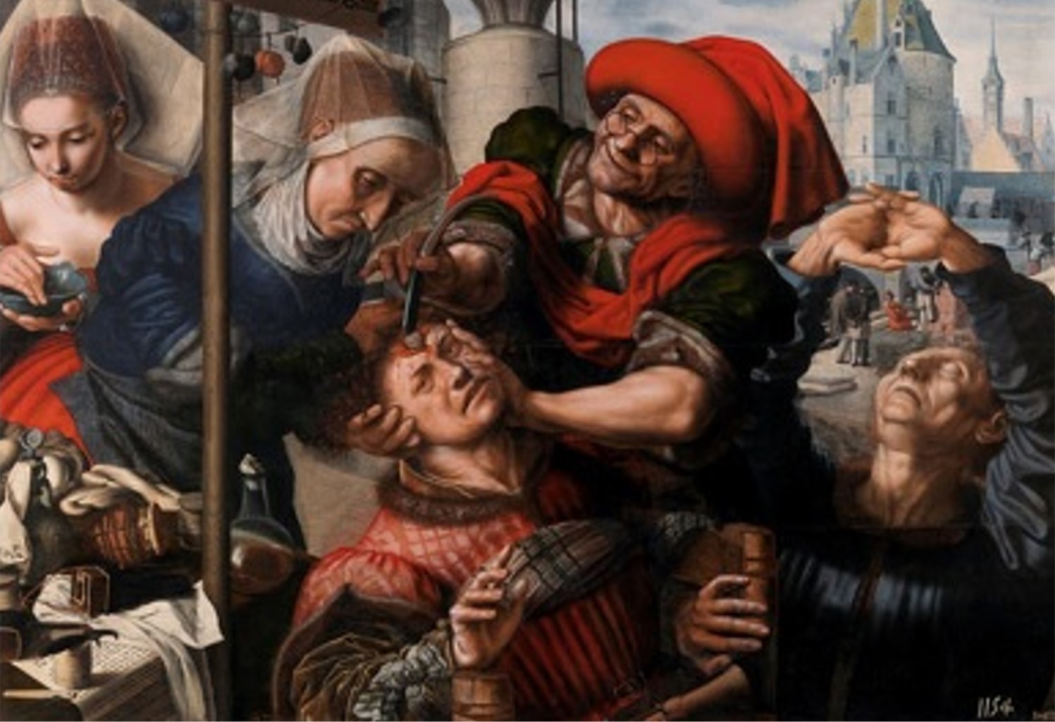 Esta práctica continúo en Roma con Galeno; durante el renacimiento, los principales cirujanos de guerra practicaban trépanos para heridas traumáticas de cráneo. En el periodo en que se realizaron las pinturas del Bosco, existían cirujanos hábiles que ejercían esta praxis normalmente en campos de batalla, como ejemplo se tiene a Giovanni da Vigo (1450-1525) y el gran cirujano Ambroise Paré (1510-1590). Se debe aclarar que los cirujanos barberos en la edad media e inicios del renacimiento se dedicaban a practicar procedimientos como: las flebotomías, remoción de piezas dentarias y drenaje de abscesos, no tenían ni capacidad ni instrumental para realizar una trepanación. Es a partir del siglo XIX que se inicia el tratamiento de las patologías neurológicas no traumáticas como tumores, epilepsia y cirugía para dolor.