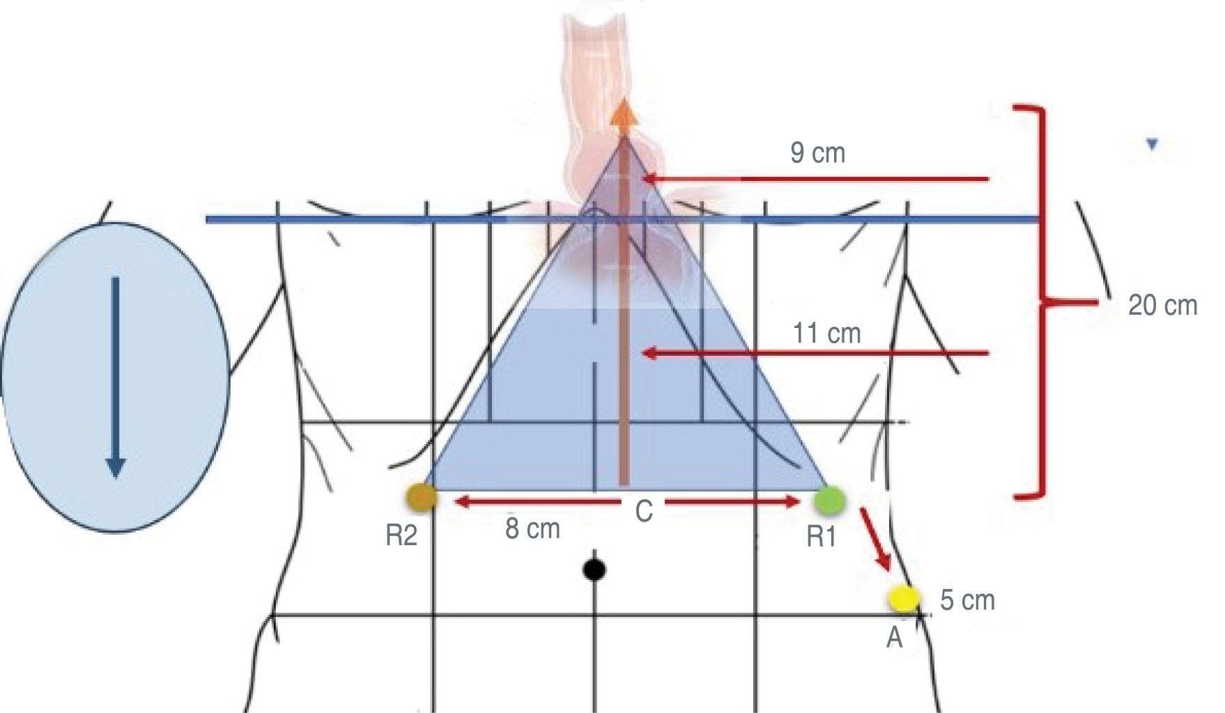 A todos los pacientes se les realizó fisiología esofágica mediante manometría de alta resolución en el protocolo preoperatorio para descartar alteraciones en la motilidad esofágica. En todos los pacientes se aplicó un procedimiento de funduplicatura tipo Nissen asistido por robot con endoscopía transoperatoria bajo anestesia general balanceada con bloqueo neuromuscular profundo, el paciente se colocó en decúbito supino, el neumoperitoneo se abordó por técnica de Veress a 12 mmHg a través de la cicatriz umbilical. Los trocares se colocan de acuerdo con la filosofía de puertos del sistema quirúrgico Da Vinci SI® (Figura 1), se realizan las medidas del sitio anatómico quirúrgico (surgical target) con la cavidad peritoneal insuflada. Se coloca marcaje para puerto de cámara a 20 cm caudales al hiato esofágico, localizado 9 cm por arriba del apéndice xifoides y se coloca trocar de 12 mm. Los trocares de 8 mm para brazo 1 y 2 robótico se colocan 8-10 cm laterales hacia la derecha y a la izquierda del trocar de la cámara, separador de Nathanson colocado subxifoides de 5 mm, trocar auxiliar de 5 mm lateral al trocar de 8 mm del lado izquierdo (sobre la línea axilar anterior) para retracción y aspiración. El docking (acoplamiento) se realizó de forma lateral (side docking) y sólo se utilizaron dos brazos robóticos de trabajo con pinzas: ProGrasp™, portaagujas con corte e inserto armónico.