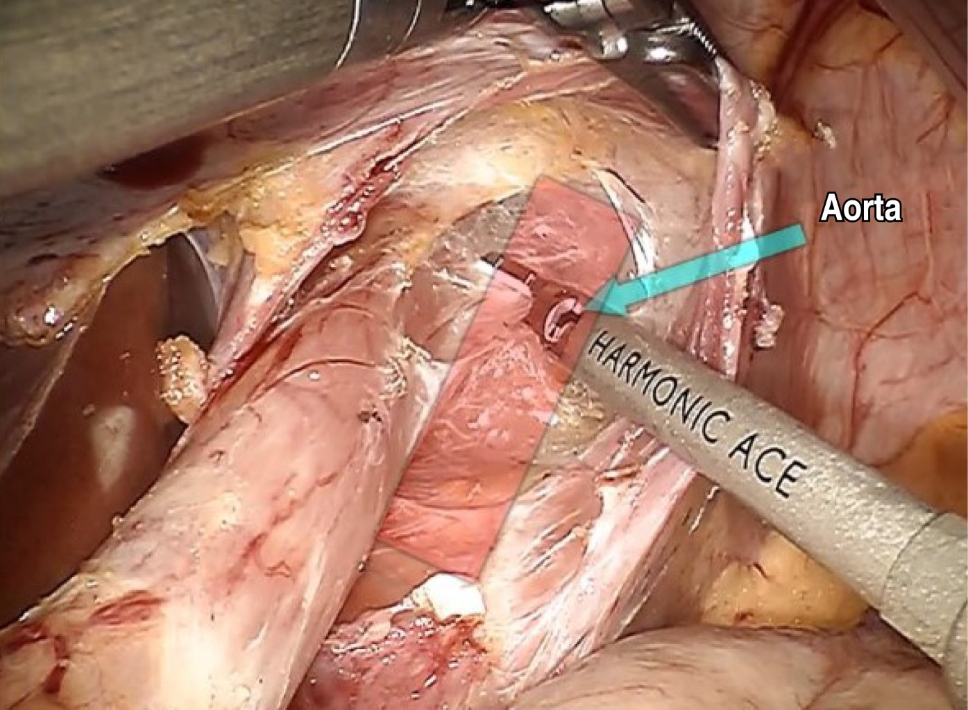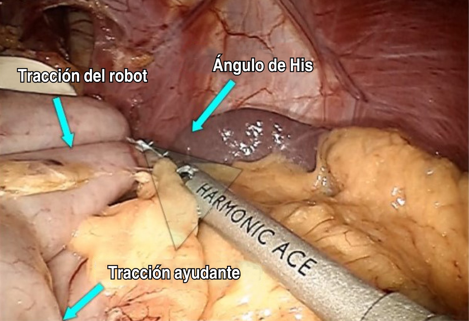 - • Liberación de vasos cortos del fundus gástrico hasta el ángulo de His con inserto armónico. (Figura 6).