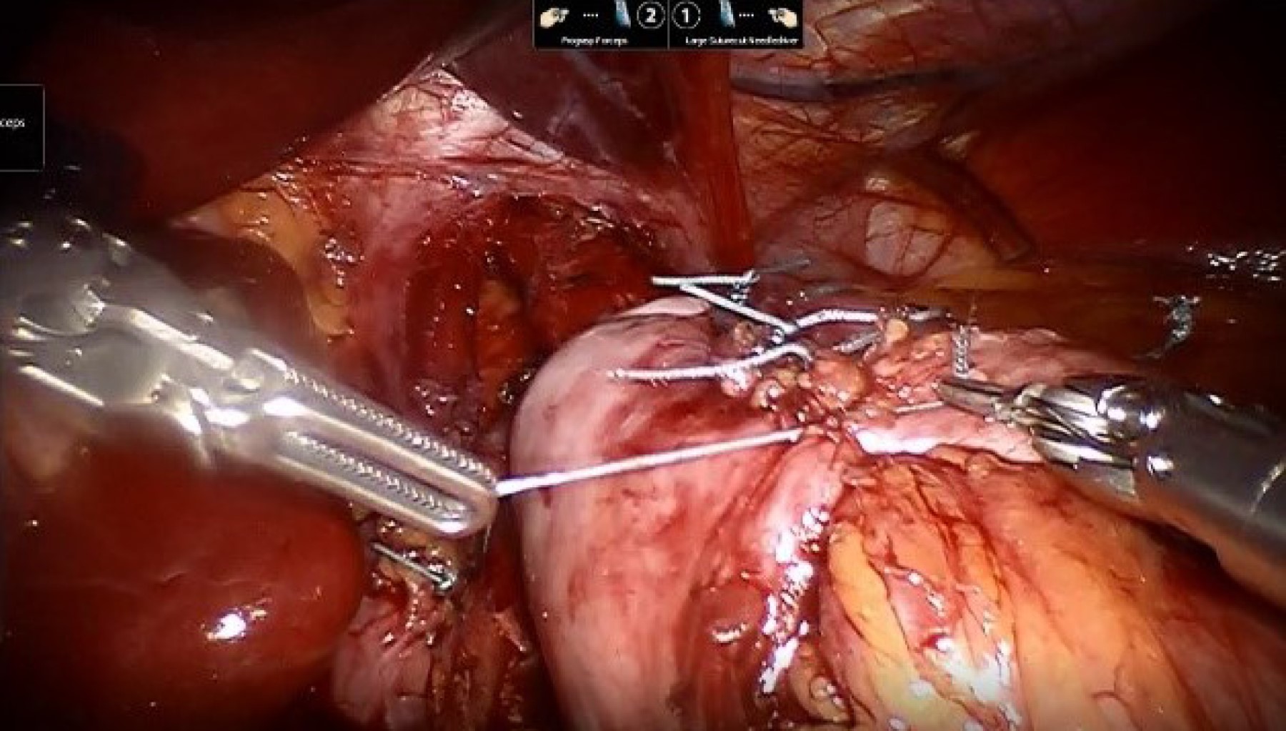- • Se realiza nuevamente funduplicatura tipo Nissen, de 2.5-3 cm de longitud con poliéster 2.0, fundus-esófago-fundus, Maloney 56Fr como calibrador.