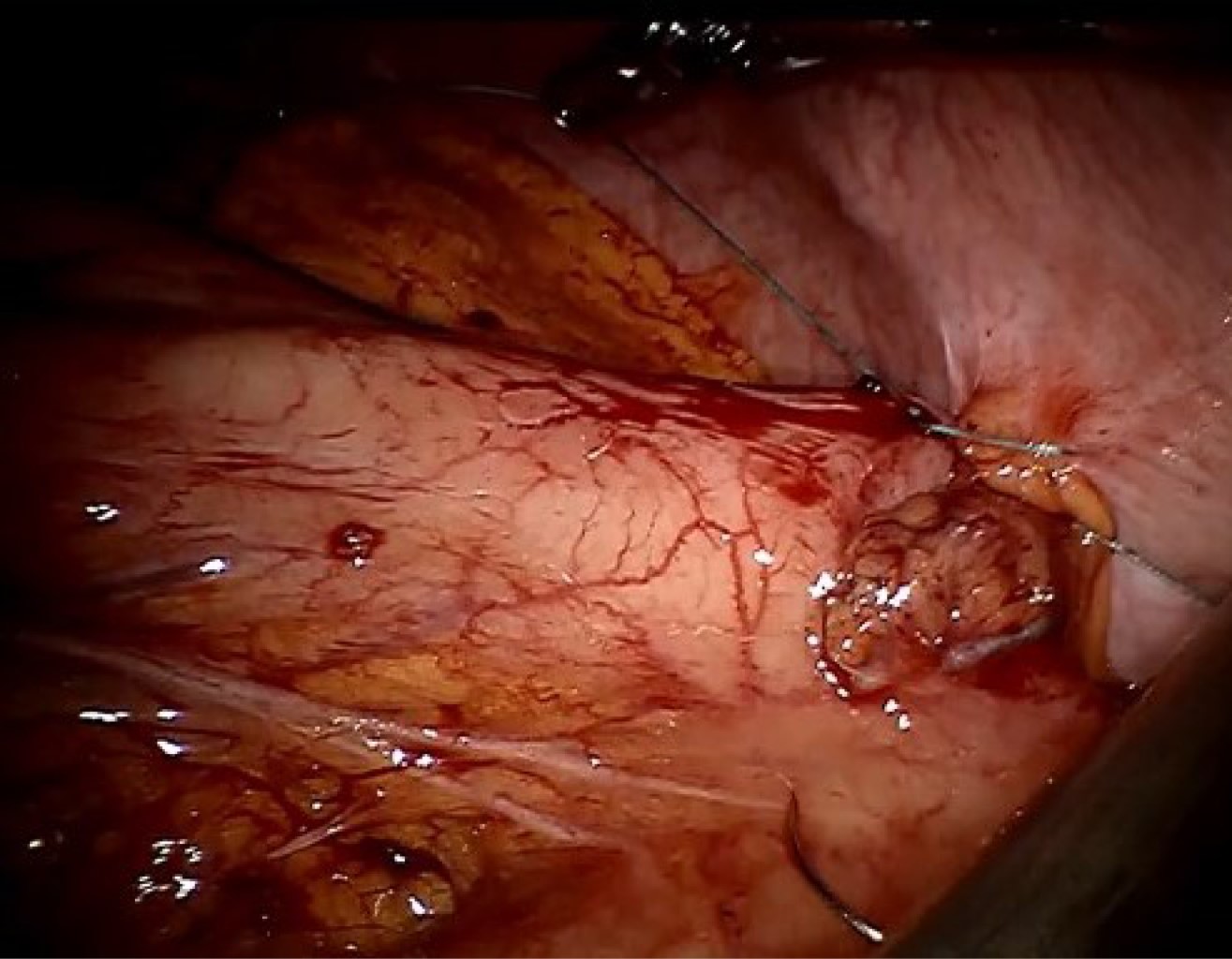 - • Posoperatorias: En una mujer de 41 años quien reingresó a los tres meses por migración de funduplicatura secundaria a esfuerzo por vómito en una intoxicación alimentaria, se resolvió con cirugía asistida por robot, reduciendo funduplicatura y gastropexia.