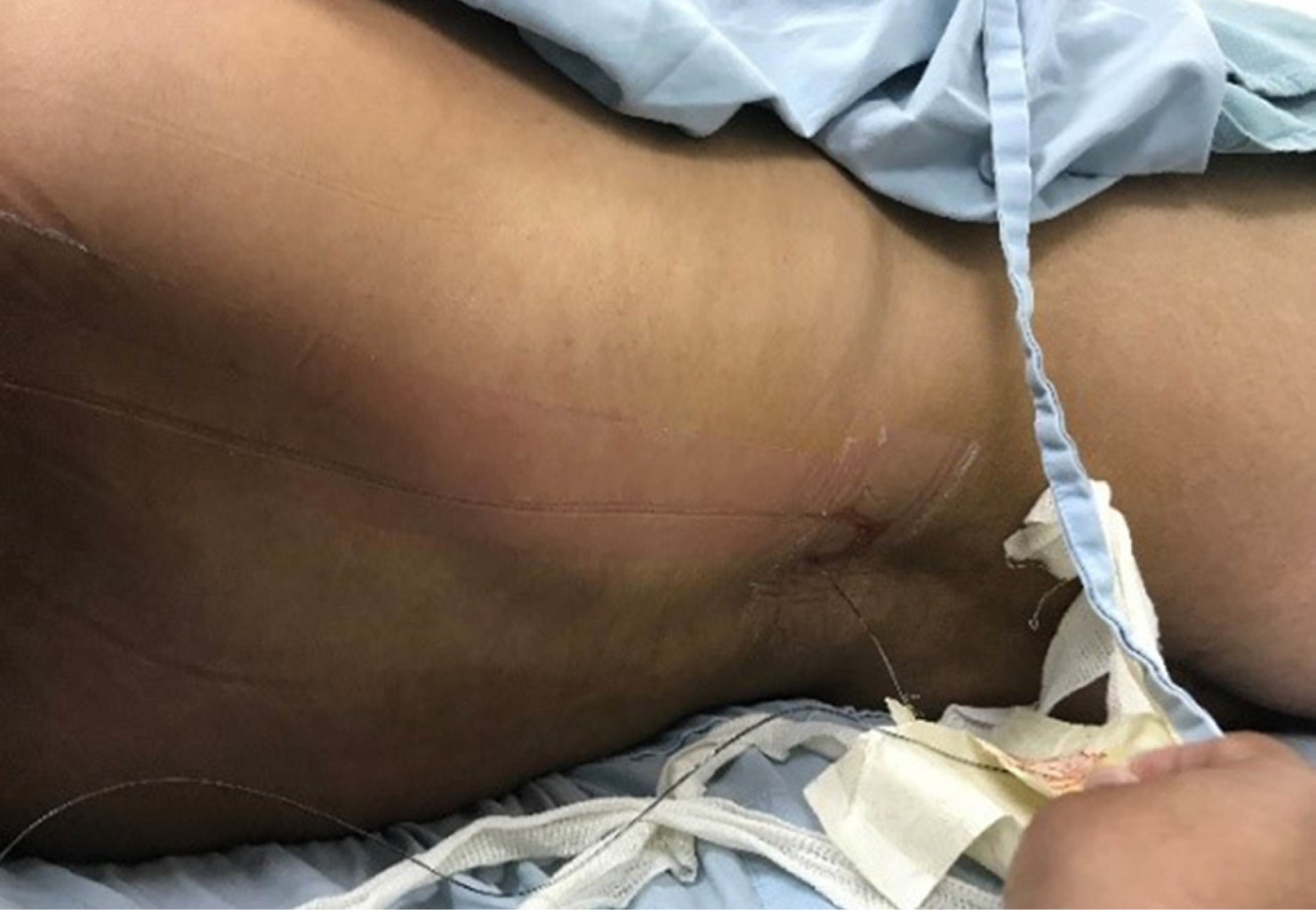 A la exploración física talla 1.68 m y peso 88 kg (IMC 31.1 kg/m2), se evidencian alteraciones craneofaciales como hipoplasia malar y micrognatia, implantación baja de orejas e hipoacusia bilateral con presencia de dispositivo coclear así como miopía. Precordio rítmico, sin fenómenos agregados y movimientos respiratorios limitados. En la columna dorsal se observa rotoescoliosis grave (Figura 1). A la valoración de la vía aérea se observa Mallampati III, distancia tiromentoniana < 6.5 cm, movilidad cervical grado II según Bellhouse-Dore, protrusión mentoniana grado III, con apertura oral > 3 cm. Paraclínicos sin contraindicaciones para la anestesia neuroaxial.
