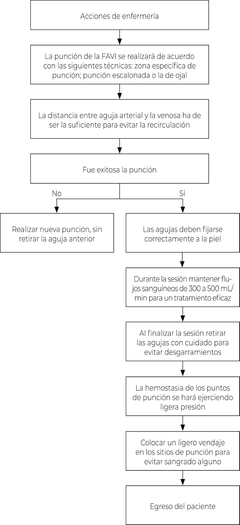 De acuerdo con el algoritmo de la "Guía de práctica clínica de manejo de acceso vascular en hemodiálisis", las acciones de enfermería para la punción de la fístula deben ser las presentadas en la Figura 1.6