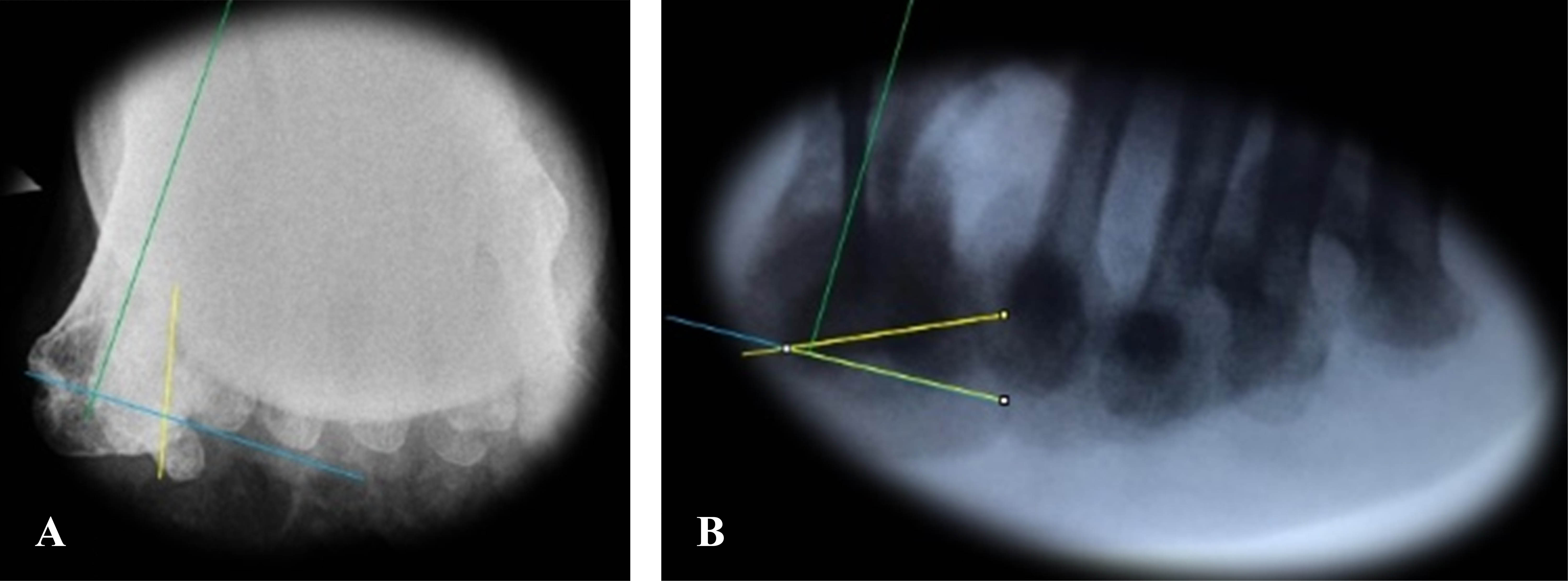 Las proyecciones anteroposteriores se realizaron con el pie apoyado sobre el tambor del fluoroscopio. Para las proyecciones axiales se colocará el rayo paralelo a los metatarsianos. El CR de la cabeza del primer metatarsiano fue evaluado utilizando el método descrito por Mortier y colaboradores en el que se evalúa la rotación de la cabeza respecto a una línea de la diáfisis del primer metatarsiano.13 Esta técnica de medición en proyecciones axiales de sesamoideos es relevante, ya que considera la diáfisis del primer metatarsiano respecto a otra línea que intercepta las corticales plantares de los surcos sesamoideos medial y lateral (Figura 1). Nuestro equipo de trabajo previamente ha determinado correlaciones intraclase estadísticamente significativas (p = 0.02) en la evaluación del componente rotacional por tres observadores que utilizan esta técnica de medición en 81 pies de 48 pacientes usando sólo radiografías prequirúrgicas (resultados no publicados).