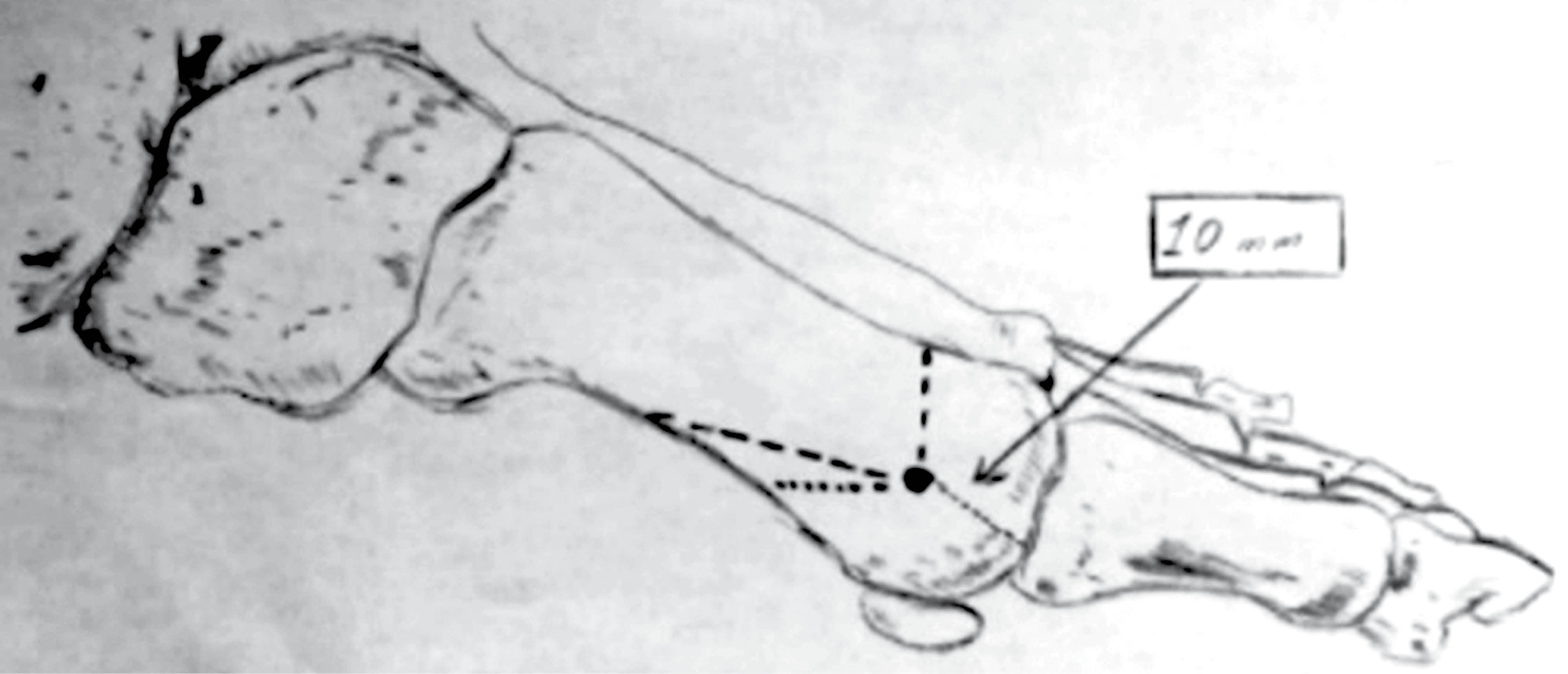 La osteotomía de Chevron modificada consiste en un corte en "V" del primer metatarsiano, con una arista larga plantar y una corta dorsal. El ápice debe situarse a 10 mm de la superficie articular (Figura 2). La cabeza del metatarsiano se desplaza lateralmente y se fija con un tornillo canulado 2.0 mm de dorso-medial a plantar-lateral. Posteriormente se realiza la osteotomía de Akin fijándose de manera externa con un vendaje correctivo.