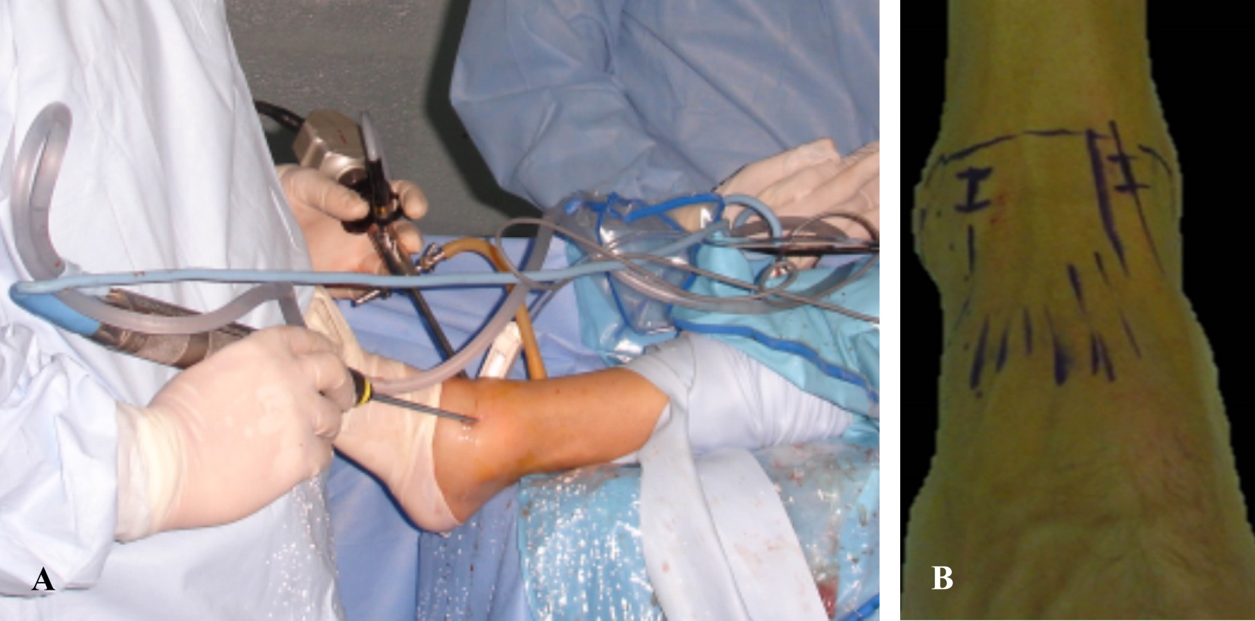 Técnica quirúrgica: se dio una dosis profiláctica de antibiótico con 1 g de cefalosporina de primera generación. El procedimiento anestésico consistió en un bloqueo peridural. El paciente se colocó en decúbito dorsal con un cojín a la altura de la pelvis del lado que se iba a operar para quitar la rotación externa fisiológica y otro cojín en la región distal de la tibia para mantenerla elevada y permitir la movilidad del tobillo (Figura 1A). El procedimiento se realizó bajo isquemia con torniquete colocado a nivel del muslo. Se hicieron los portales y el procedimiento descritos por Van Dijk para artroscopía anterior (Figura 1B). No se usó instrumental para pequeñas articulaciones. Se identificaron las estructuras óseas de referencia y las goteras medial y lateral. Mediante movimientos de flexoextensión del tobillo se buscaron las estructuras que condicionaran un pinzamiento. Se retiró la sinovitis o lesión meniscoide encontradas en caso de lesiones de tejido blando (Figura 2) y la resección de osteofitos se realizó con fresa 4.0 mm.