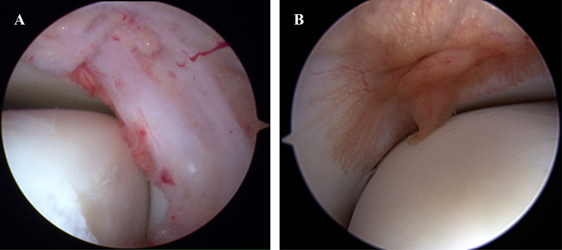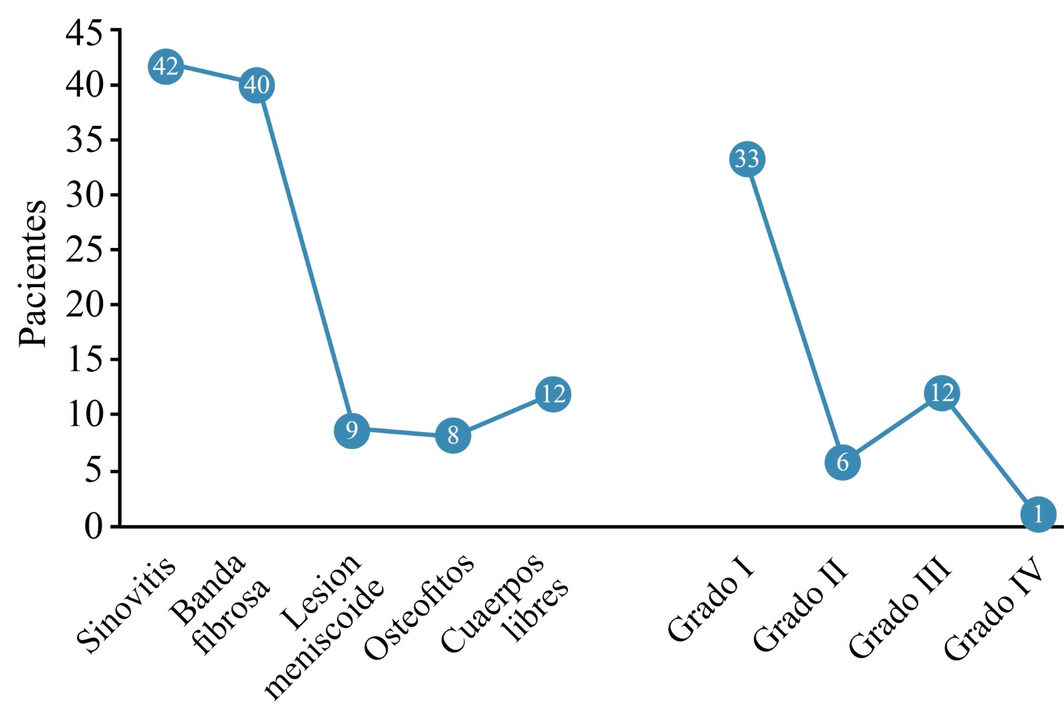 Entre el tipo de lesión en tejidos blandos se reportaron sinovitis, banda fibrosa y lesión meniscoide, la lesión mixta fue la más frecuente presentándose en 34 de los pacientes (68%). De estos casos las combinaciones fueron las siguientes: 26 casos (52%) mostraron sinovitis y banda fibrosa, siete (14%) presentaron las tres lesiones juntas, sinovitis, banda fibrosa y lesión meniscoide y sólo en un caso (2%) se observó una banda fibrosa y lesión meniscoide. En 16 pacientes (32%) se presentaron lesiones únicas, la sinovitis fue la más frecuente hallándose en nueve casos (18%), banda fibrosa en seis (12%) y lesión meniscoide en un paciente (2%).