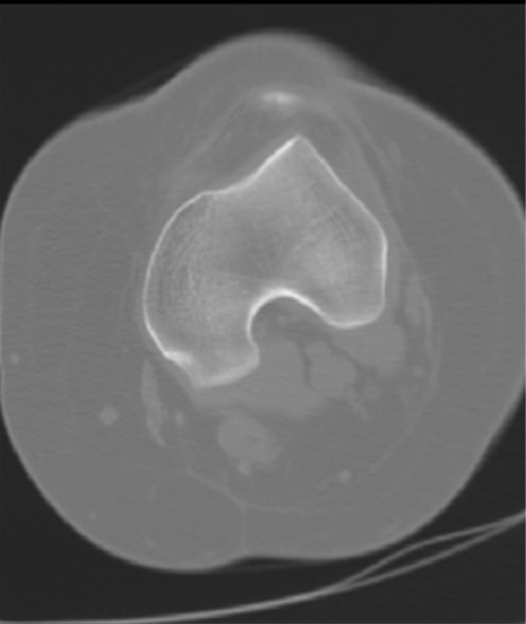 La displasia troclear se define como un surco troclear con un ángulo mayor de 145o.2,3 La misma se evalúa combinando una serie de cortes tomográficos axiales de la tróclea femoral y mediante un perfil estricto de rodilla (existiendo una perfecta superposición de ambos cóndilos femorales en su región posterior). En la radiografía simple se valorará el contorno de las facetas y posterior a ellas, la línea que representa la parte más profunda del surco troclear.