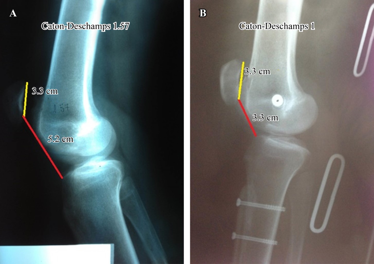 El método diagnóstico más preciso para validar una altura rotuliana excesiva es el índice de Caton-Deschamps (con la rodilla en 30o de flexión) porque se basa en una relación de puntos anatómicos fácilmente identificables y reproducibles y es posible, independientemente del tamaño de la rótula y de la configuración troclear, determinar la altura rotuliana. A su vez, fue demostrado que el método de Caton-Deschamps tiene menos variación interobservador en la comparación preoperatoria y postoperatoria y es, aparentemente, más sensible para detectar seudopatelas bajas12 (Figura 2).