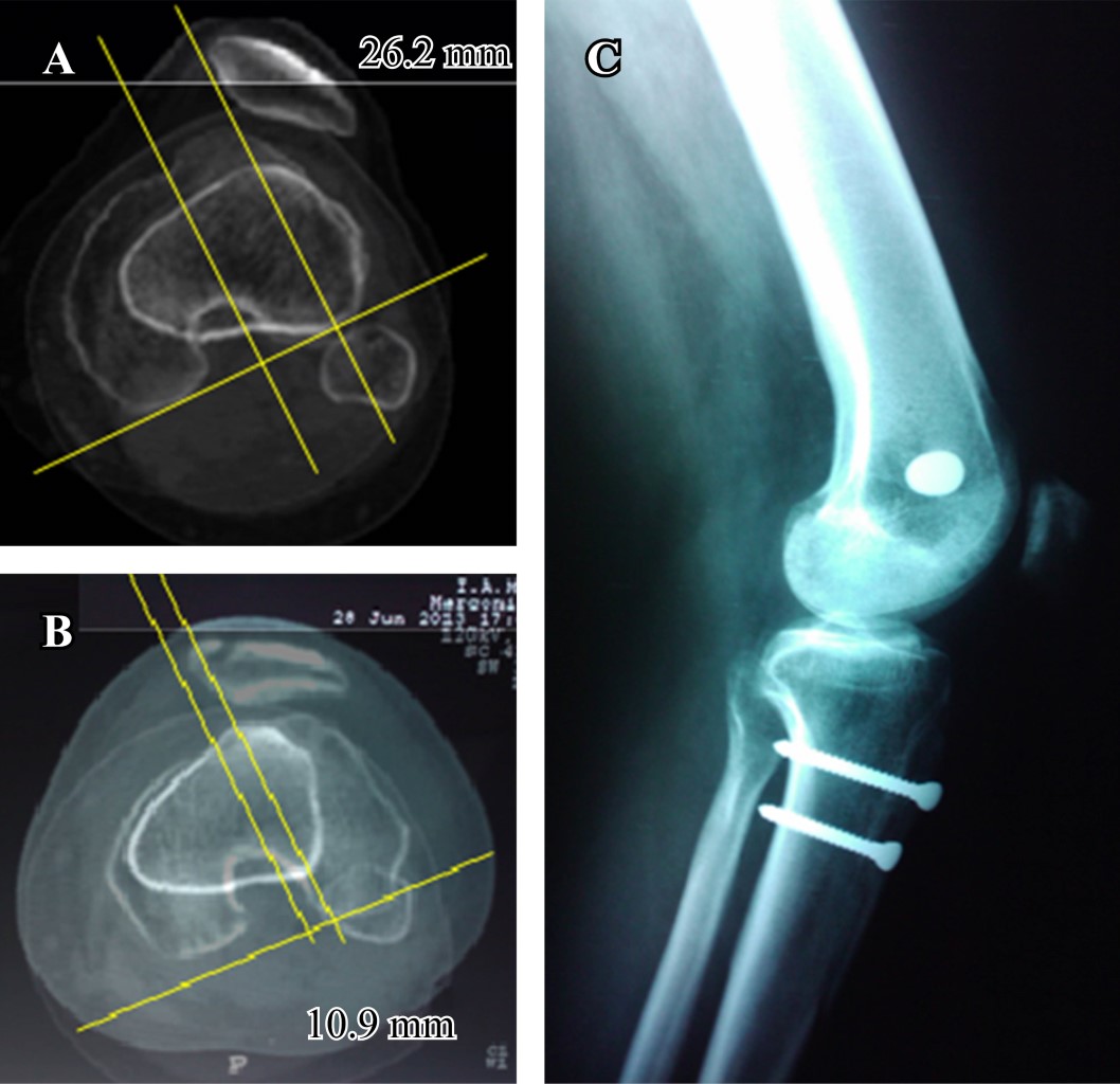 El procedimiento quirúrgico más común para el tratamiento de las luxaciones recidivantes femoropatelares es la osteotomía de la tuberosidad tibial, la cual es indicada en presencia de patela alta o un TT-TG aumentado. En este caso, el procedimiento de Roux Elmslie-Trillat es el de preferencia, siendo ésta una osteotomía completa o incompleta dependiendo de la presencia o no de una patela alta.8,9,10