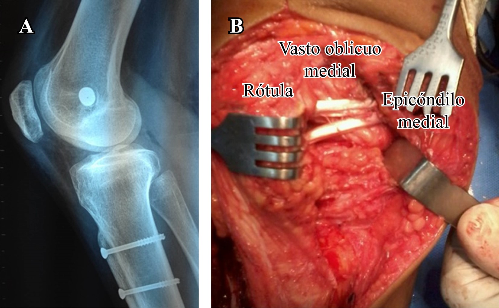 El procedimiento es completado con una reconstrucción del ligamento patelofemoral medial utilizando un injerto de tendón semitendinoso, el cual se tuneliza a través de la rótula y se fija en el punto de isometría femoral según Schottle (Figura 6).15
