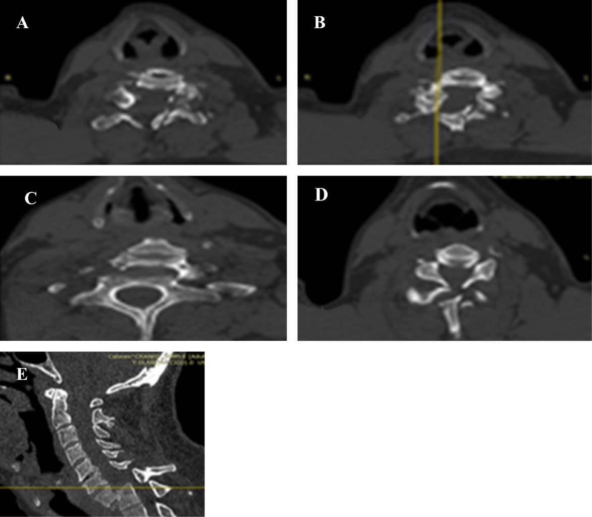 Se realiza serie traumática encontrando en la proyección AP de columna cervical (Figura 1A y B) incongruencia anatómica con un ángulo de lateralidad marcado (Figura 1C). Proyección lateral C1-C6 (Figura 2). TAC cráneo fractura de ambas láminas de C6 fractura de faceta inferior izquierda ipsilateral (Figura 2A y B) luxación de C7 sobre T1 (Figura 2C). Fractura de la plataforma superior de T1 más desplazamiento de 100% del cuerpo vertebral de C7 sobre el cuerpo vertebral de T1 (Figura 2C y D). Angiotomografía (Figura 3) realizada permitió descartar lesiones en vasos supraaórticos y descartar variantes que complicaran la realización del abordaje.