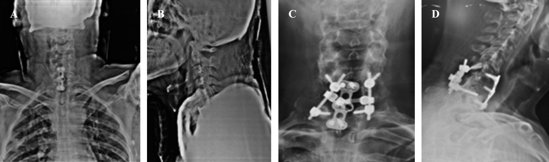 Se programa primer tiempo quirúrgico para realizar hemicorpectomía C7, discectomía C7-T1, espondilodesis con placa anterior dos niveles C6-C7, C7-T1, más toma y aplicación de injerto de cresta ilíaca, se corrobora resultado mediante TAC. Se realiza segundo tiempo quirúrgico siete días posteriores de primera intervención realizando abordaje cervical posterior + fascetectomías de C7 + fijación transfacetarias C6 y transpedicular de T1 con tornillos, barras y un cross-link (Figura 4).