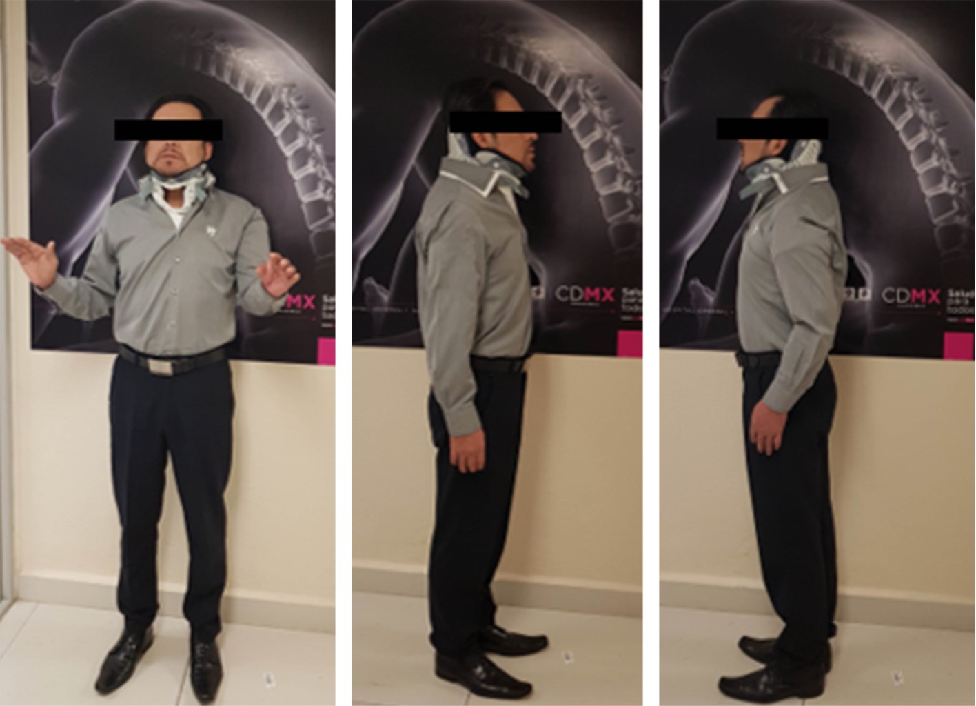 Masculino de 50 años, originario y residente de la Ciudad de México (peso 74 kg) quien sufre accidente automovilístico; colisiona contra muro de contención produciéndose desaceleración frontal que genera lesión de tipo hiperextensión-compresión de la columna cervicotorácica. Refirió desde el momento del accidente dolor intenso en cuello al realizar movimientos. Presentó pérdida de conciencia; fue llevado por paramédicos al servicio de urgencias más cercano donde se inmovilizó con collarín cervical rígido. Posteriormente trasladado a otro hospital donde se realizan estudios encontrando lesión cervical, se inicia esquema NASCIS II y es trasladado a nuestra unidad clínica de columna para manejo y tratamiento.