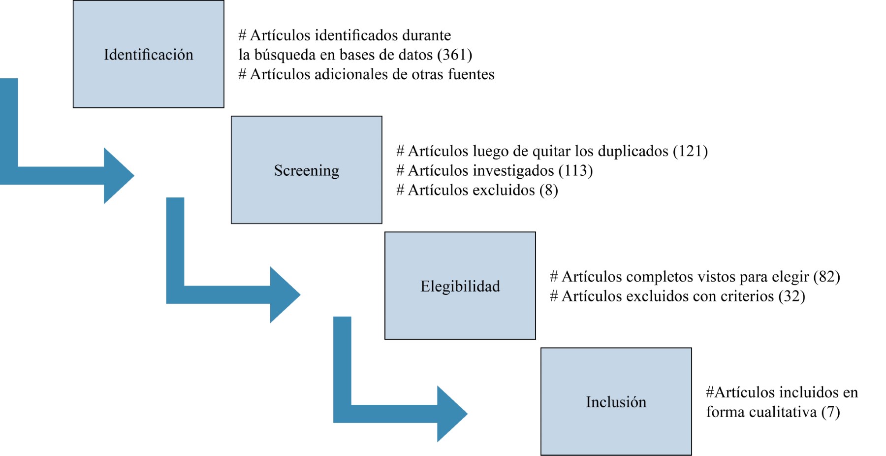 Luego de eliminar los artículos duplicados, el cribado dio como resultado 113 publicaciones, al analizar el texto completo de cada estudio se seleccionaron 82 con criterios de elegibilidad (Figura 1). Siete artículos cumplieron con los criterios de inclusión según tipo de estudio y participantes. En relación a la fecha de publicación sólo un artículo fue publicado entre 1990 y 1999,14 un artículo entre 2000 y 2009,12 cinco fueron publicados entre 2010 y Mayo de 2017.11,16,17,18,19