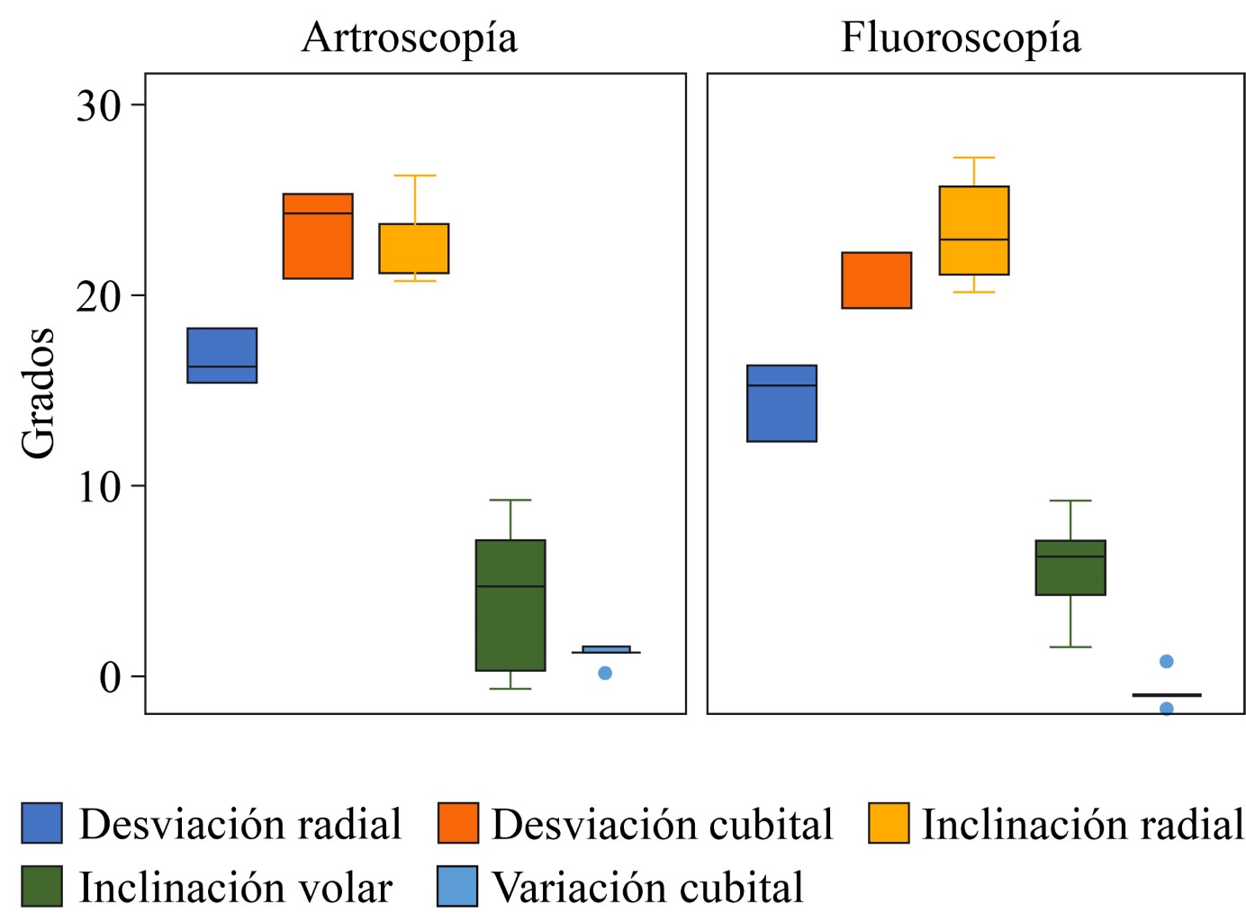 La evaluación de parámetros radiográficos (inclinación radial, inclinación volar, varianza cubital) fue documentada en cinco trabajos.11,12,14,18,19 Sólo Doi y colaboradores14 y Kordasiewicz y colegas16 estudiaron el grado de artrosis mediante la Clasificación Kirk and Jupiter.3