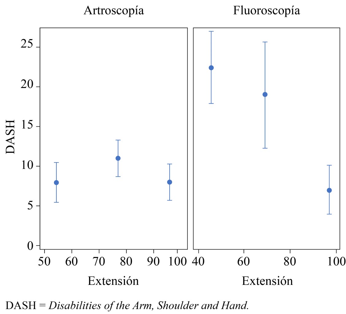 Respecto al escore DASH, éste presentó correlación significativa con la edad promedio de los pacientes (R = 0.78, p = 0.002) y con extensión, aunque de manera diferencial: sólo fue indirecta en fluoroscopía (R = -0.34, p = 0.042). La Figura 4 ilustra dichas asociaciones y en promedio para ambos tratamientos.