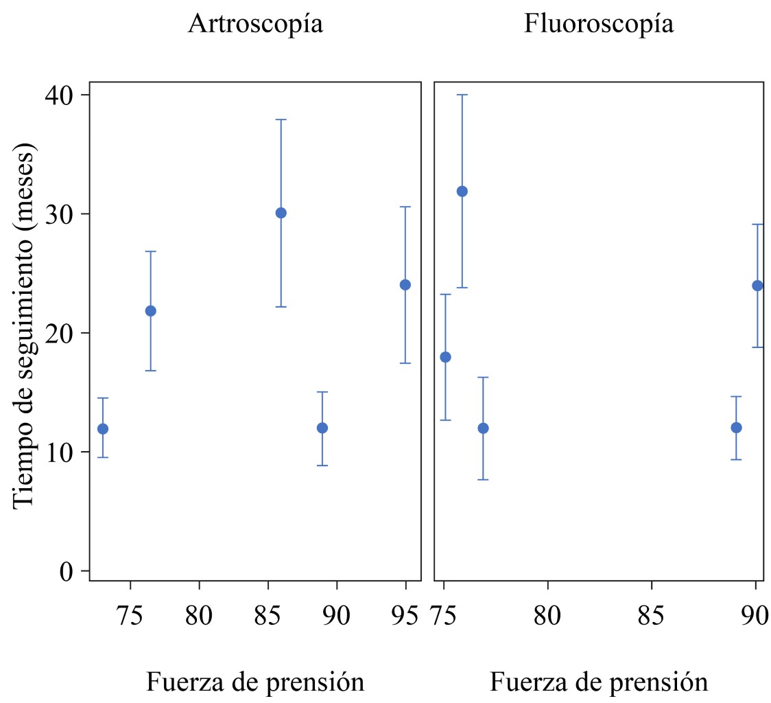 La fuerza de prensión no se correlacionó con el tiempo de seguimiento (p = 0.312) (Figura 5). Cuando la asociación entre esta variable (fuerza de prensión) y flexión se analizó por tratamiento, sólo mostró correlación directa y significativa en los grupos de pacientes tratados con fluoroscopía (R = 0.97, p = 0.003 versus R = 0.14, p = 0.74, mediante artroscopía).