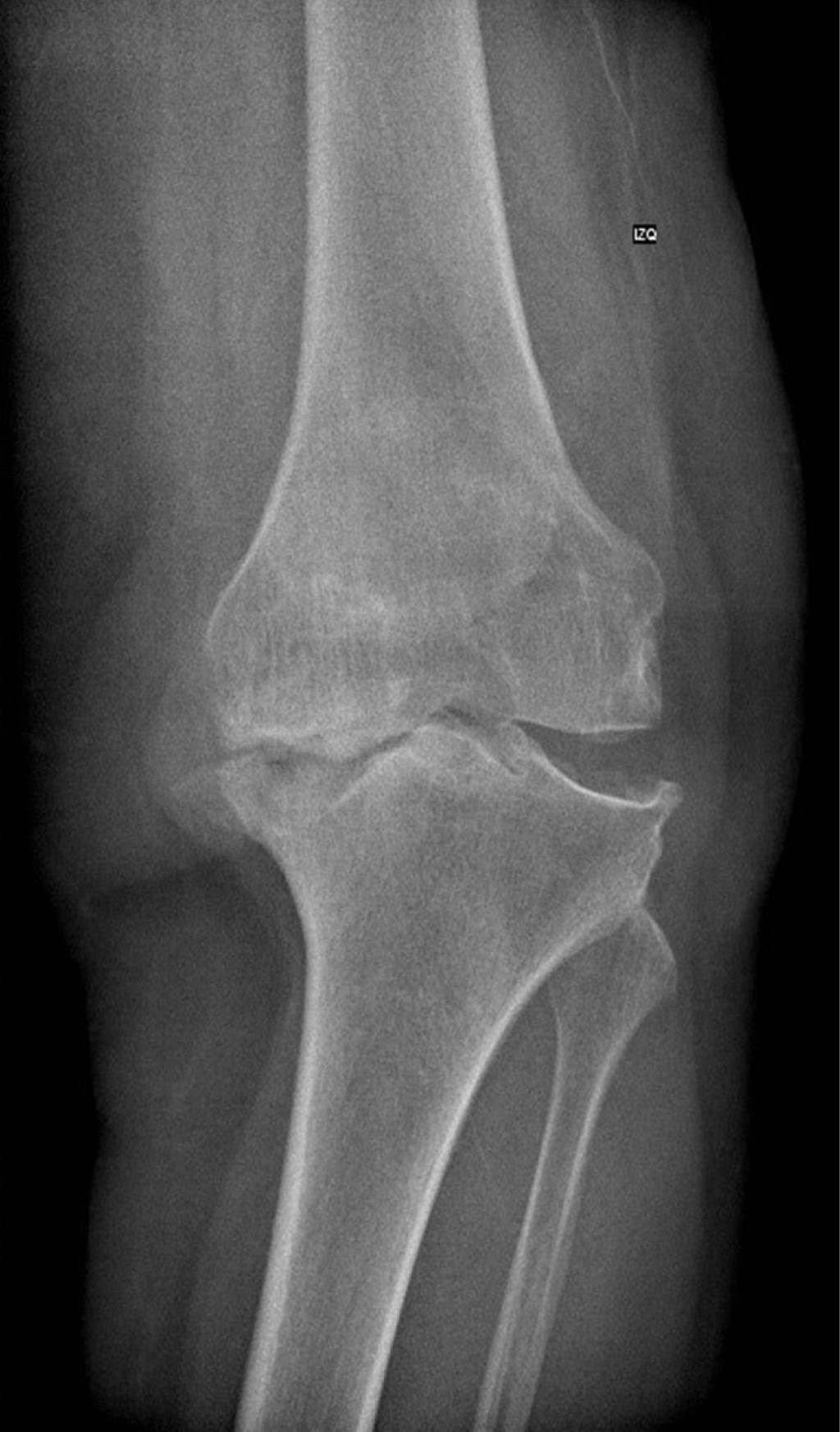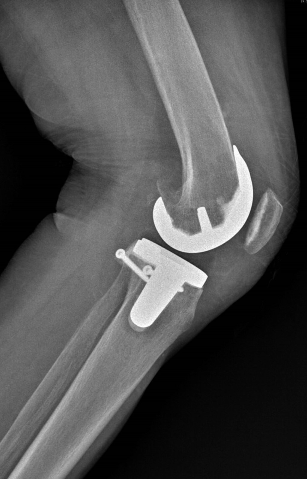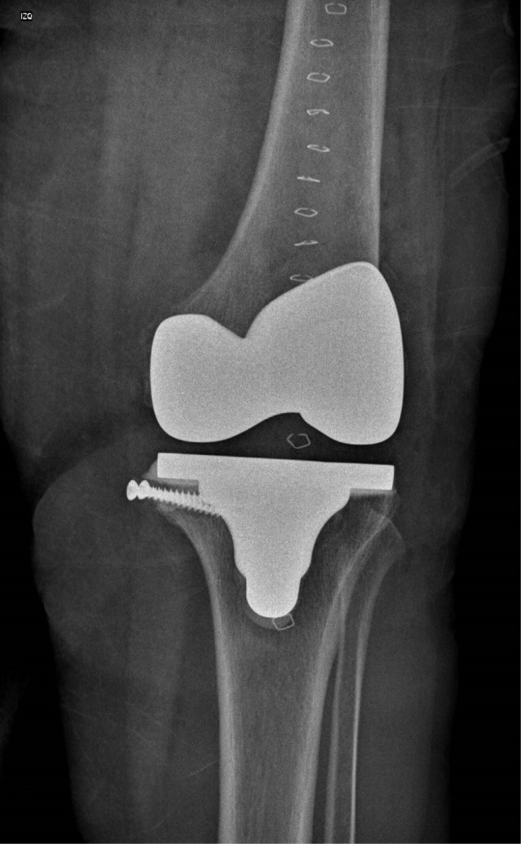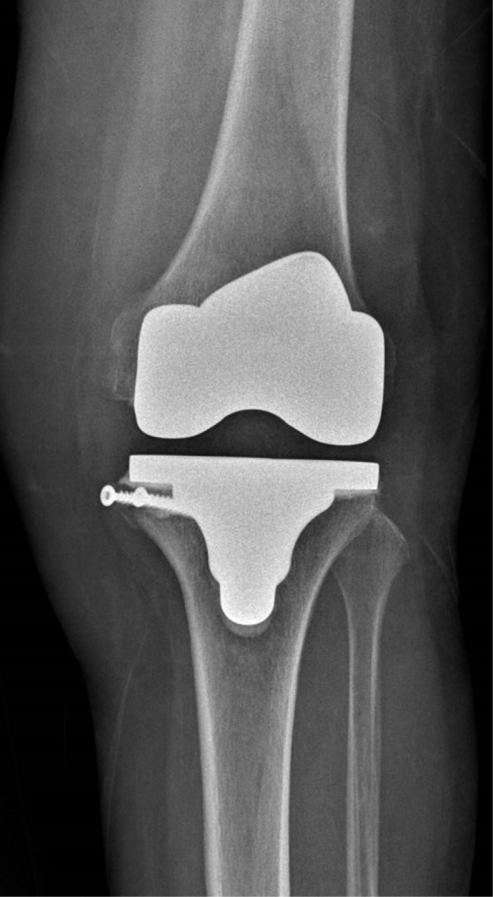 Se presenta caso de mujer de 62 años, dedicada al cuidado del hogar, con antecedente de presbiacusia, la cual acude a consulta externa por gonalgia bilateral, de predominio izquierdo, de siete años de evolución. A la exploración física se aprecia franca deformidad en varo en ambas rodillas (Figura 1), de mayor magnitud en lado izquierdo, con marcha independiente asistida con bastón, rango de movilidad activo con extensión de -5o, flexión de 85o, Ficat y cepillos positivos, cajones negativos y bostezo medial positivo, con limitación por dolor para las actividades de la vida diaria y dolor en EVA de 8. Se solicitan y revisan radiografías anteroposterior (Figura 2) y lateral (Figura 3) de ambas rodillas en bipedestación, encontrando gonartrosis bilateral Kellgreen & Lawrence IV, con defecto tibial medial en rodilla izquierda, por lo cual se le propone tratamiento quirúrgico con artroplastia total de rodilla izquierda posteroestabilizada, debido a la mayor sintomatología en dicho lado.