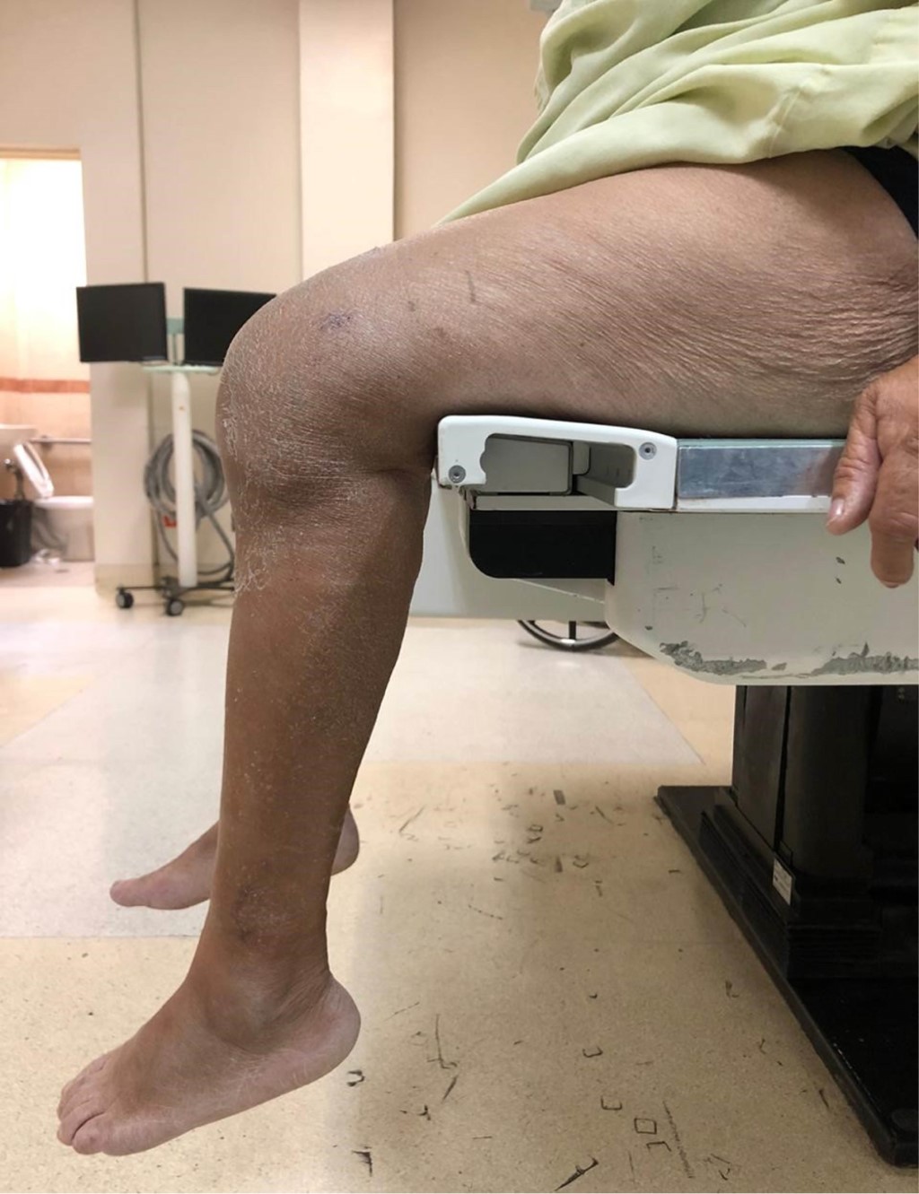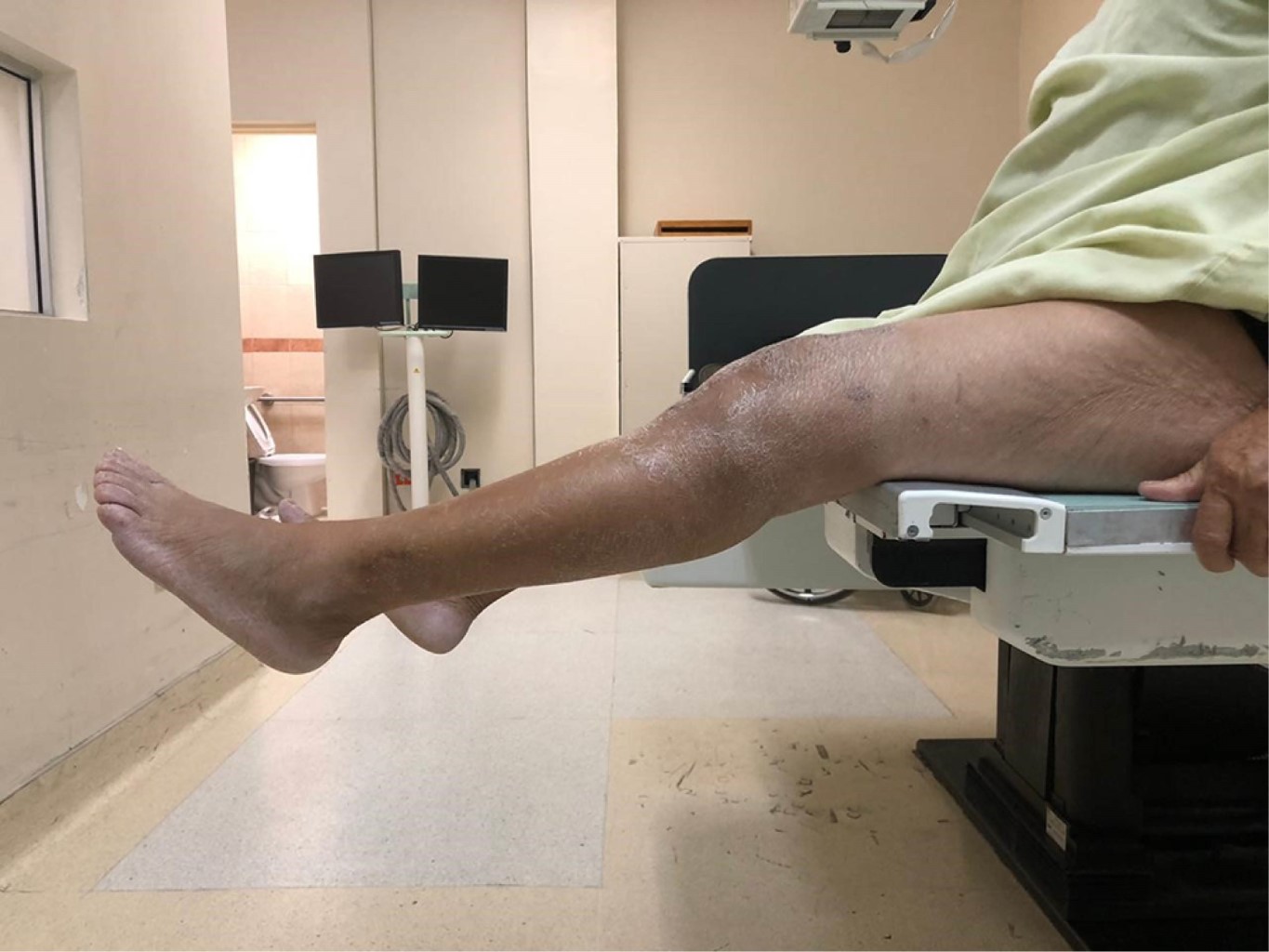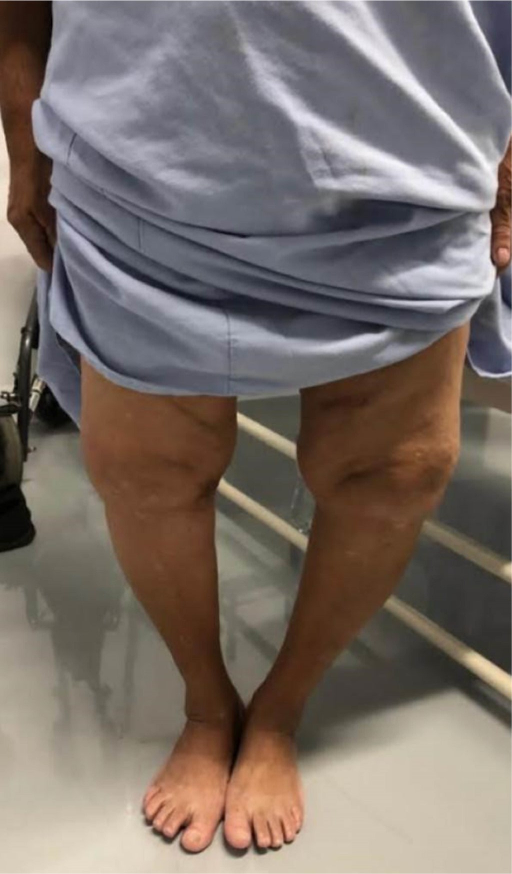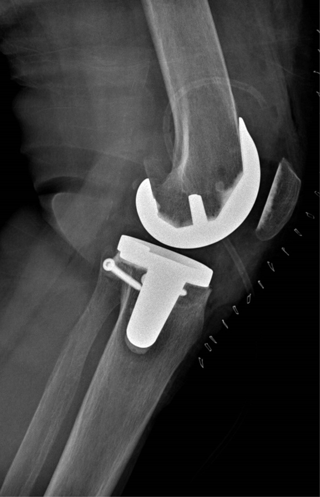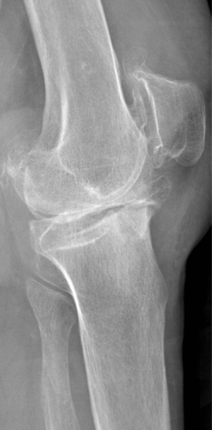 Se presenta caso de mujer de 62 años, dedicada al cuidado del hogar, con antecedente de presbiacusia, la cual acude a consulta externa por gonalgia bilateral, de predominio izquierdo, de siete años de evolución. A la exploración física se aprecia franca deformidad en varo en ambas rodillas (Figura 1), de mayor magnitud en lado izquierdo, con marcha independiente asistida con bastón, rango de movilidad activo con extensión de -5o, flexión de 85o, Ficat y cepillos positivos, cajones negativos y bostezo medial positivo, con limitación por dolor para las actividades de la vida diaria y dolor en EVA de 8. Se solicitan y revisan radiografías anteroposterior (Figura 2) y lateral (Figura 3) de ambas rodillas en bipedestación, encontrando gonartrosis bilateral Kellgreen & Lawrence IV, con defecto tibial medial en rodilla izquierda, por lo cual se le propone tratamiento quirúrgico con artroplastia total de rodilla izquierda posteroestabilizada, debido a la mayor sintomatología en dicho lado.