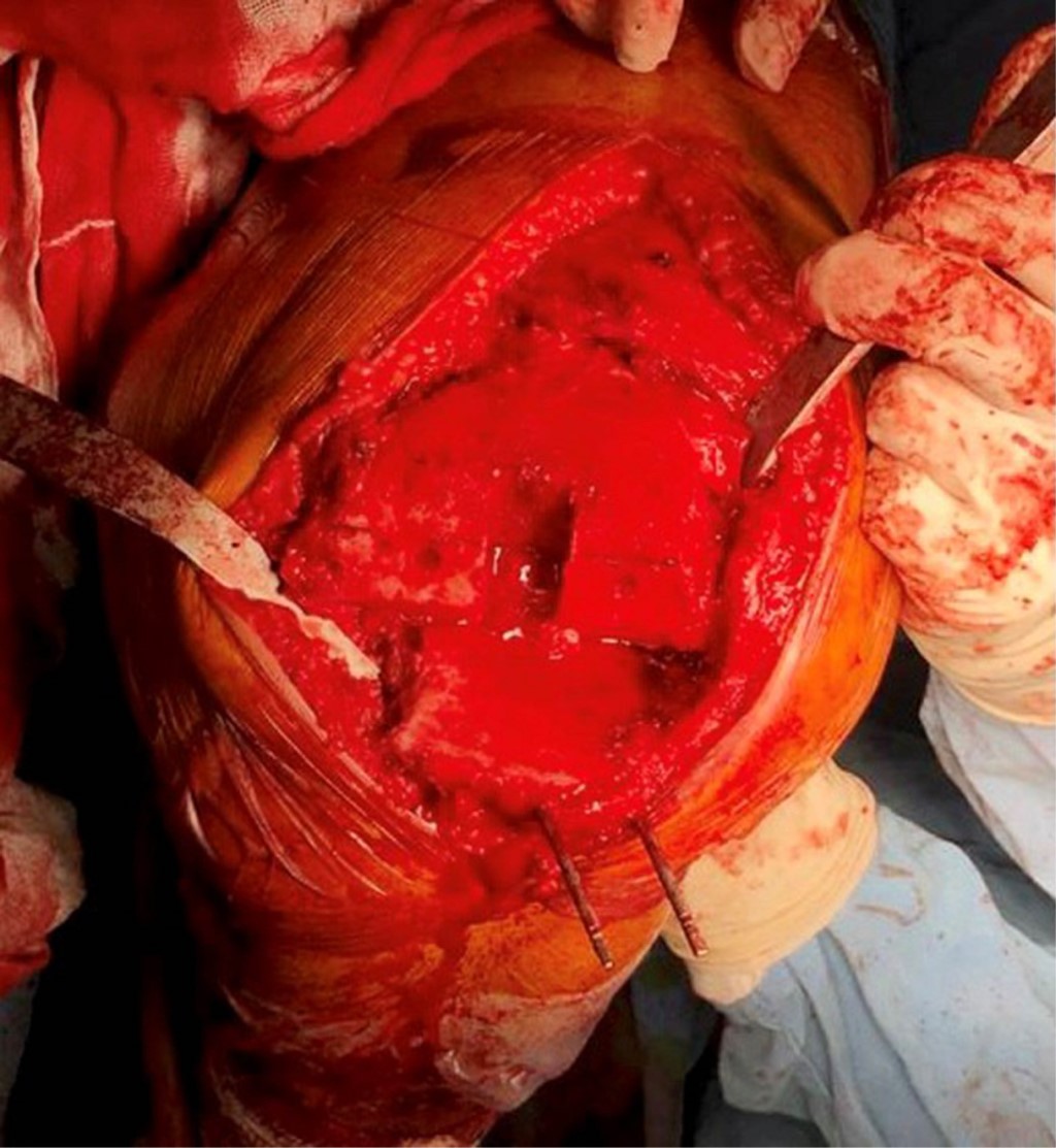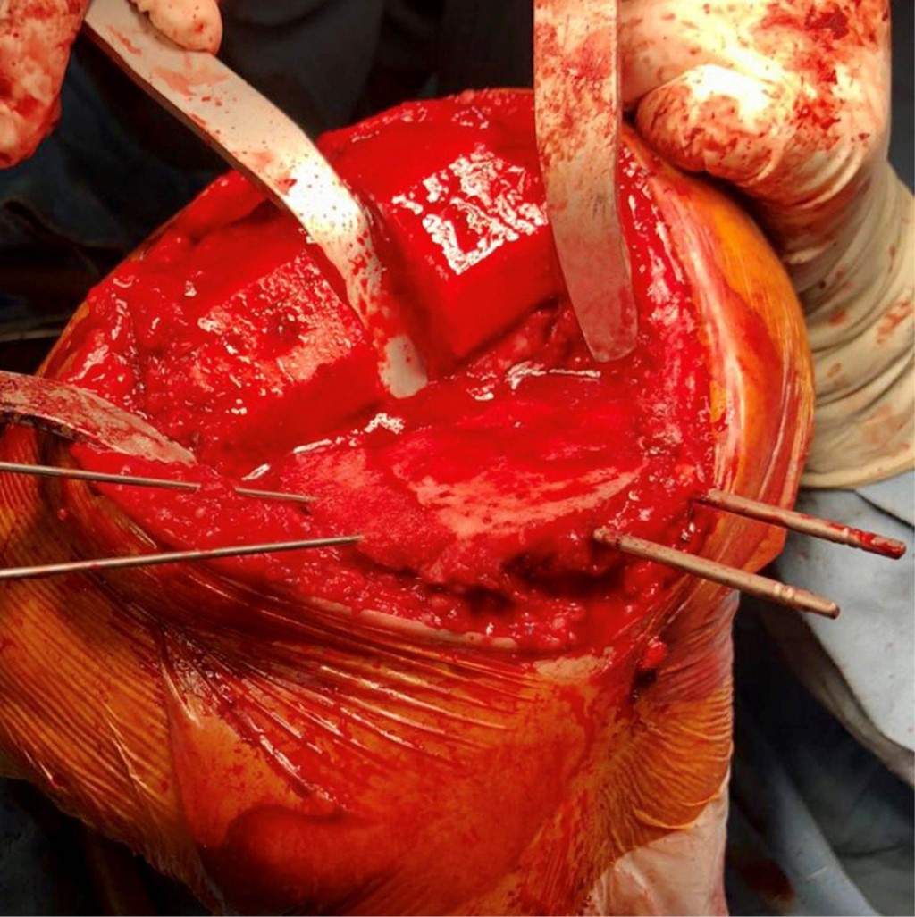 Se realiza abordaje anterior a rodilla izquierda con artrotomía transvasto, luxando patela sin eversión, hacia lateral, se retiran osteofitos femorales y ligamento cruzado anterior y posterior, y se realiza corte femoral distal con valgo de 7o, posteriormente realizando corte tibial en 0o. Se mide tamaño de plantilla femoral, siendo de tamaño 5, y se realizan cortes anteriores, posteriores y chaflanes en fémur con 3o de rotación externa. Se visualiza defecto tibial de 5 mm de profundidad (Figura 4) y se regulariza borde con sierra para hueso, obteniendo lecho plano y sangrante, adecuado para colocación de injerto. Se recupera bloque de hueso para injerto proveniente de osteotomía de corte femoral y se coloca en zona de defecto tibial realizando osteodesis con clavos Kirschner de 1.6 mm (Figura 5). Después se coloca nuevamente plantilla de corte tibial y se regulariza altura de injerto con sierra, procediendo a fijación definitiva con tornillos de esponjosa 4.0 mm de rosca completa con dirección de medial a lateral, cuidando no invadir espacio metafisario central para colocación de implante tibial. Se introduce espaciador de 10 mm en espacio tibiofemoral y se realiza balanceo de tejidos blandos con técnica de pie crusting sobre estructuras mediales hasta obtener gaps simétricos en flexión y extensión. Se mide tamaño de componente tibial, siendo de tamaño 3, y se determina rotación adecuada alineando punto medio de plantilla con la unión del tercio medial con tercio medio de tuberosidad tibial anterior, después se realiza perforación metafisaria, sin interferencia de tornillos de fijación de injerto. Se coloca plantilla de prueba y se procede a medir y realizar corte patelar para componente de tamaño 38 con medialización de componente. Se verifica adecuada movilidad y estabilidad, retiro de componentes de prueba, se coloca isquemia, irrigación de lecho quirúrgico, sellado interfase entre injerto y metáfisis tibial con cemento y se procede a colocar implantes definitivos cementados, con inserto 10 posteroestabilizado (Figuras 6 y 7). Se verifican rangos de movimiento alcanzando flexión de 130o y extensión de 0o, con adecuado balanceo de tejidos blandos, después se cierra por planos hasta piel.