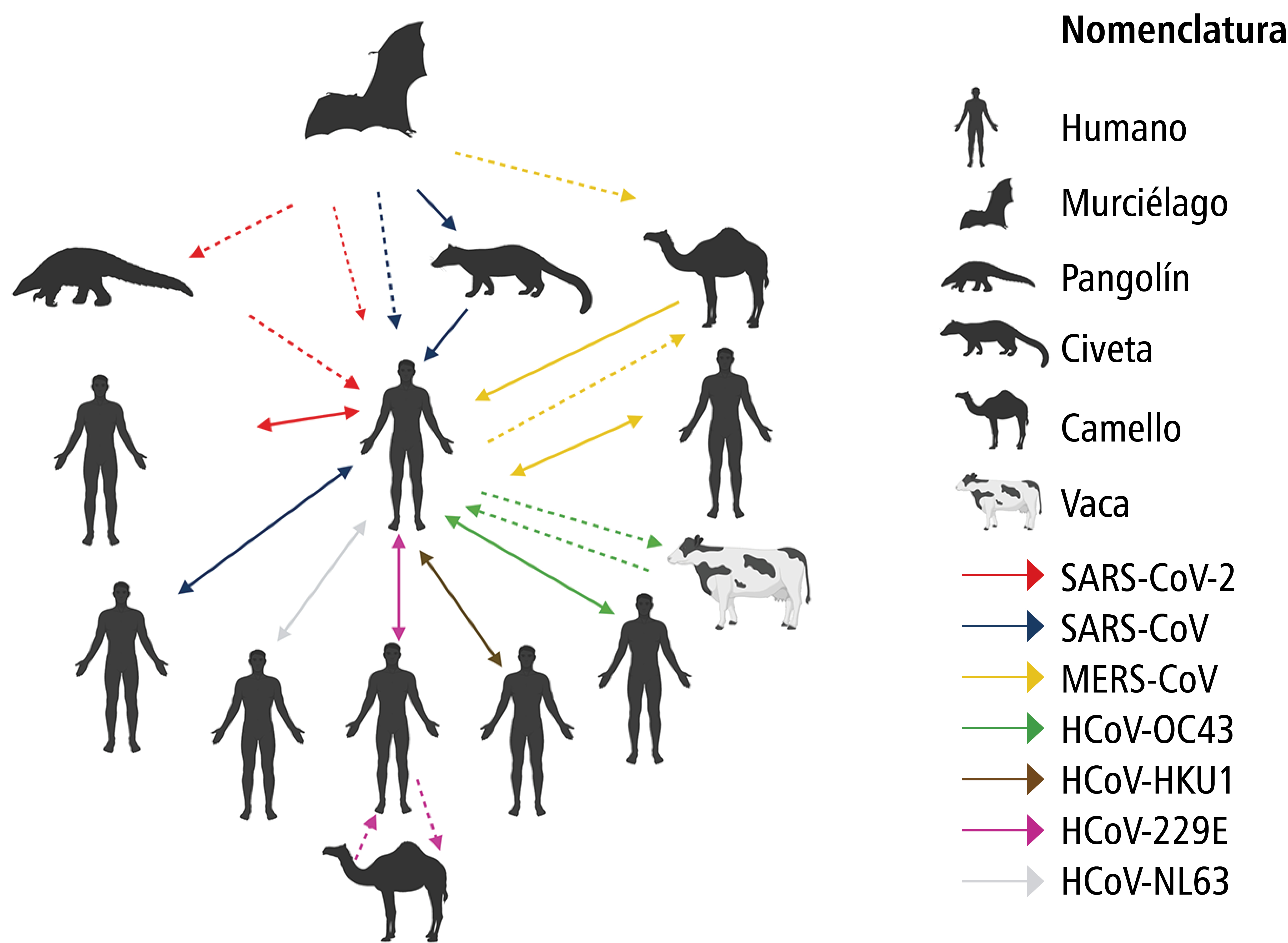 La evidencia disponible indica que los CoVs 229E, OC43, NL63 y HKU1 están bien adaptados a humanos; por lo que circulan ampliamente en la población y en la mayoría de los casos causan enfermedad leve. A la fecha, no se ha documentado ninguno de estos virus dentro de un reservorio animal. Sin embargo, en el caso de SARS-CoV y MERS-CoV, los virus no están tan bien adaptados para ser mantenidos en humanos y, por lo tanto, es probable que se propaguen principalmente en reservorios zoonóticos, con transmisión ocasional en la población humana susceptible y posiblemente a través de una especie hospedadora intermedia.