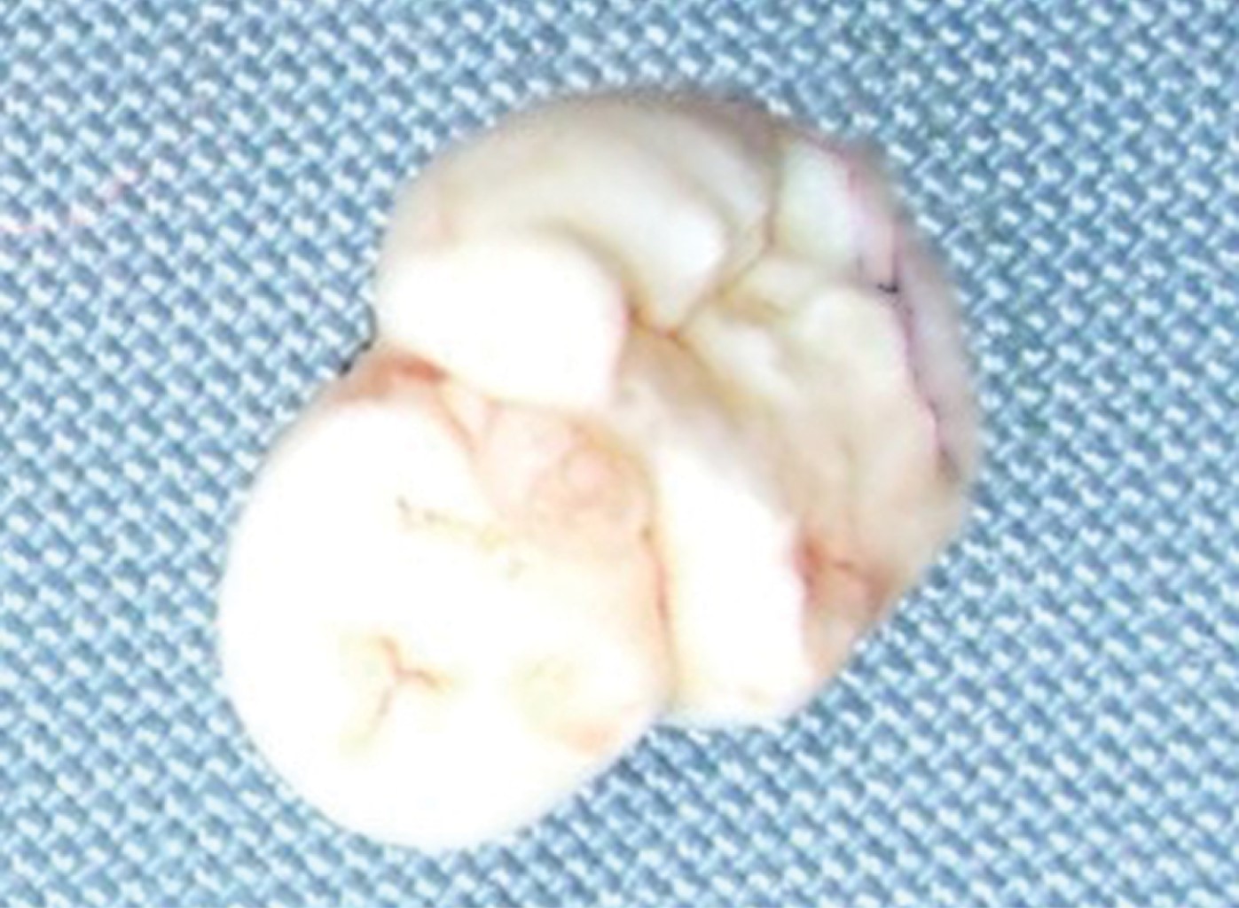 Caso 3. Varón de 17 años de edad, sin datos clínicos contribuyentes, referido para manejo quirúrgico previo a tratamiento ortodóntico consistente en odontectomía de terceros molares. Al evaluar la imagen radiográfica del tercer molar inferior derecho se observó que presentaba una morfología coronal inusual, por lo que se estableció el diagnóstico presuntivo de fusión con un diente supernumerario (Figura 7), mismo que fue corroborado tras la odontectomía. El cuarto molar se encontraba fusionado en el aspecto distolingual del tercer molar (Figura 8).
