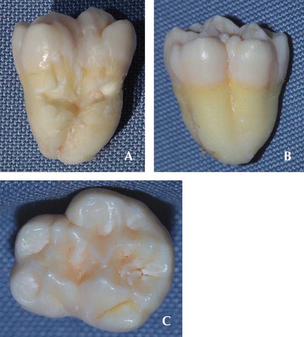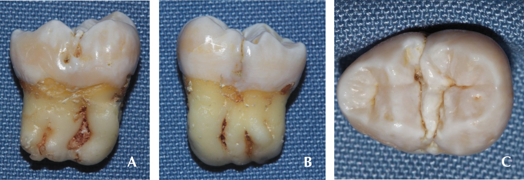 Caso 2. Hombre de 22 años de edad, quien acude a la Clínica Universitaria de Atención a la Salud (CUAS) Estado de México de la Facultad de Estudios Superiores Zaragoza (FES-Z) de la Universidad Nacional Autónoma de México (UNAM) por presentar episodios repetitivos de pericoronitis asociada al tercer molar inferior derecho parcialmente erupcionado. Al interrogatorio sin antecedentes médicos y dentales de importancia. Al realizar la exploración física intrabucal se observó que dicho órgano dentario presentaba macrodoncia y morfología irregular, por lo que se sospechó de fusión con un distomolar (Figura 3), lo cual se corroboró con la evaluación radiográfica (Figura 4) y del espécimen quirúrgico postodontectomía (Figura 5). El cuarto molar se encontraba fusionado en el aspecto distal del tercer molar y la unión se presentaba a nivel coronal y radicular compartiendo la misma cámara pulpar (Figura 6).