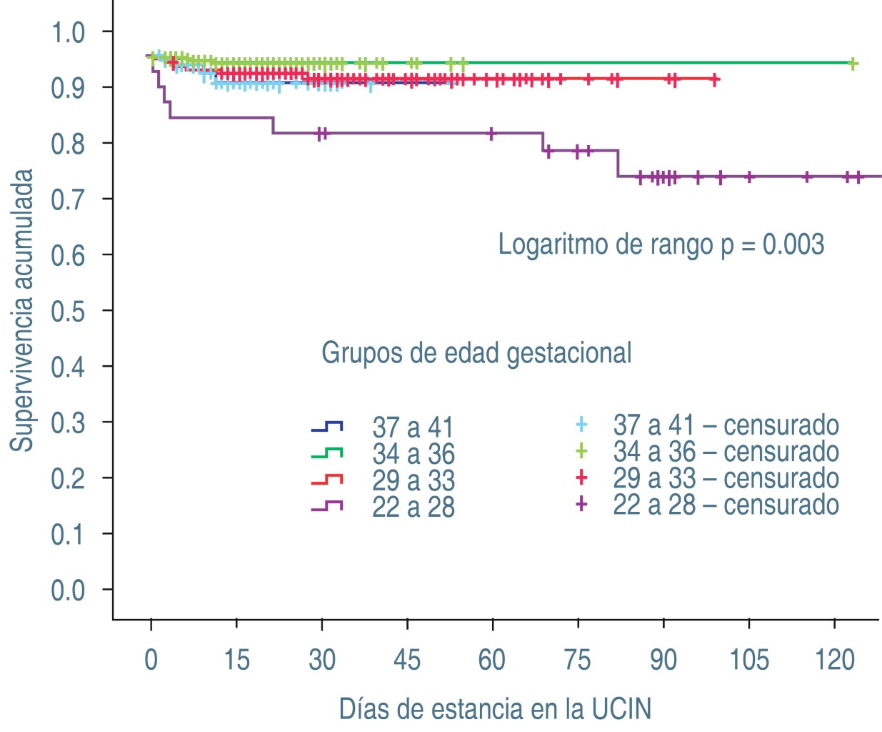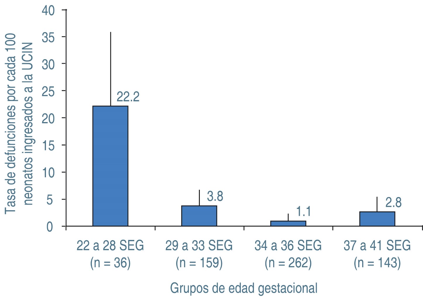 Análisis estadístico. Los pacientes se agruparon según su edad gestacional al nacimiento: de 22 a 28 semanas de edad gestacional (SEG), de 29 a 33, de 34 a 36, y de 37 a 41. Se obtuvo la tasa de mortalidad hospitalaria por cada 100 ingresos, por edad gestacional. Para cada tasa se calculó el intervalo de confianza al 95% (IC95%). La comparación entre las tasas se realizó con prueba de χ2 de Pearson. Se construyeron curvas de Kaplan y Meier, y la comparación entre grupos fue con la prueba de logaritmo de rango. Los diferentes análisis se realizaron con el programa SPSS, versión 23.0.