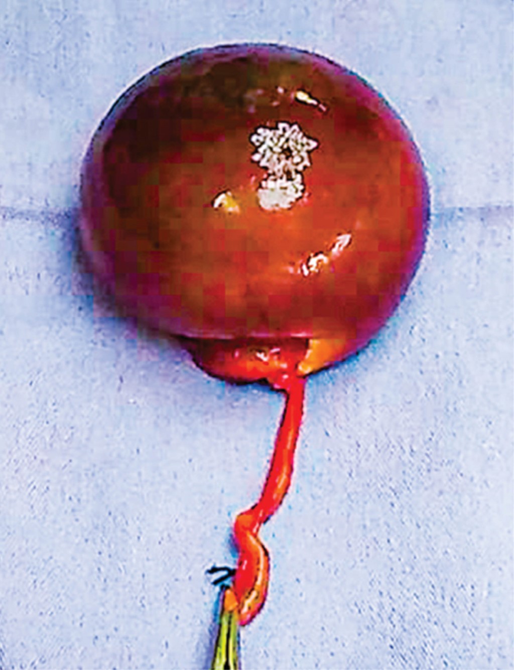 Ese mismo día se procedió a realizar laparotomía exploradora, en la que se encontró un tumor quístico de ovario derecho de 40 × 40 mm, con adherencias a apéndice cecal e intestino delgado. Se realizó apendicetomía incidental por adherencias del tumor más salpingooforectomía derecha (Figuras 3 y 4). No se encontró invasión del tumor hacia las estructuras.