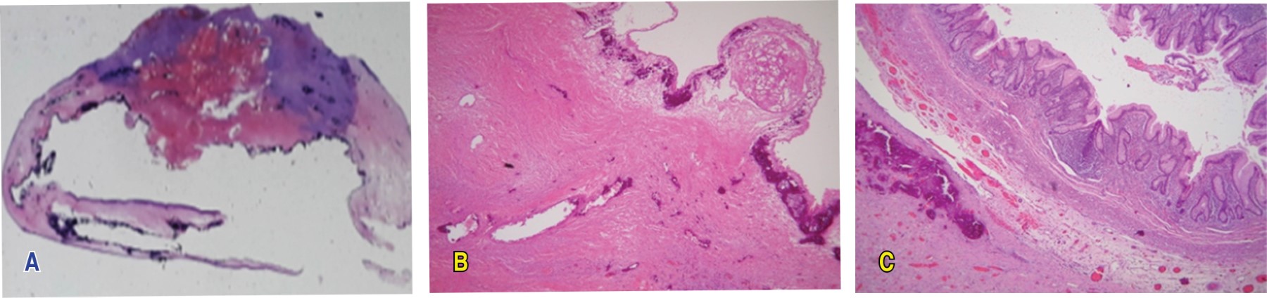 El reporte histopatológico reportó: tumor de ovario derecho compatible con cistadenoma seroso de ovario calcificado, con extensa congestión vascular, edema y necrosis isquémica, apéndice cecal sin alteraciones adherido a la pared del tumor quístico. Se consideró que los cambios isquémicos y las calcificaciones eran compatibles con torsión prenatal del tumor de larga evolución. La salpinge se observó con extensa congestión vascular (Figura 5).