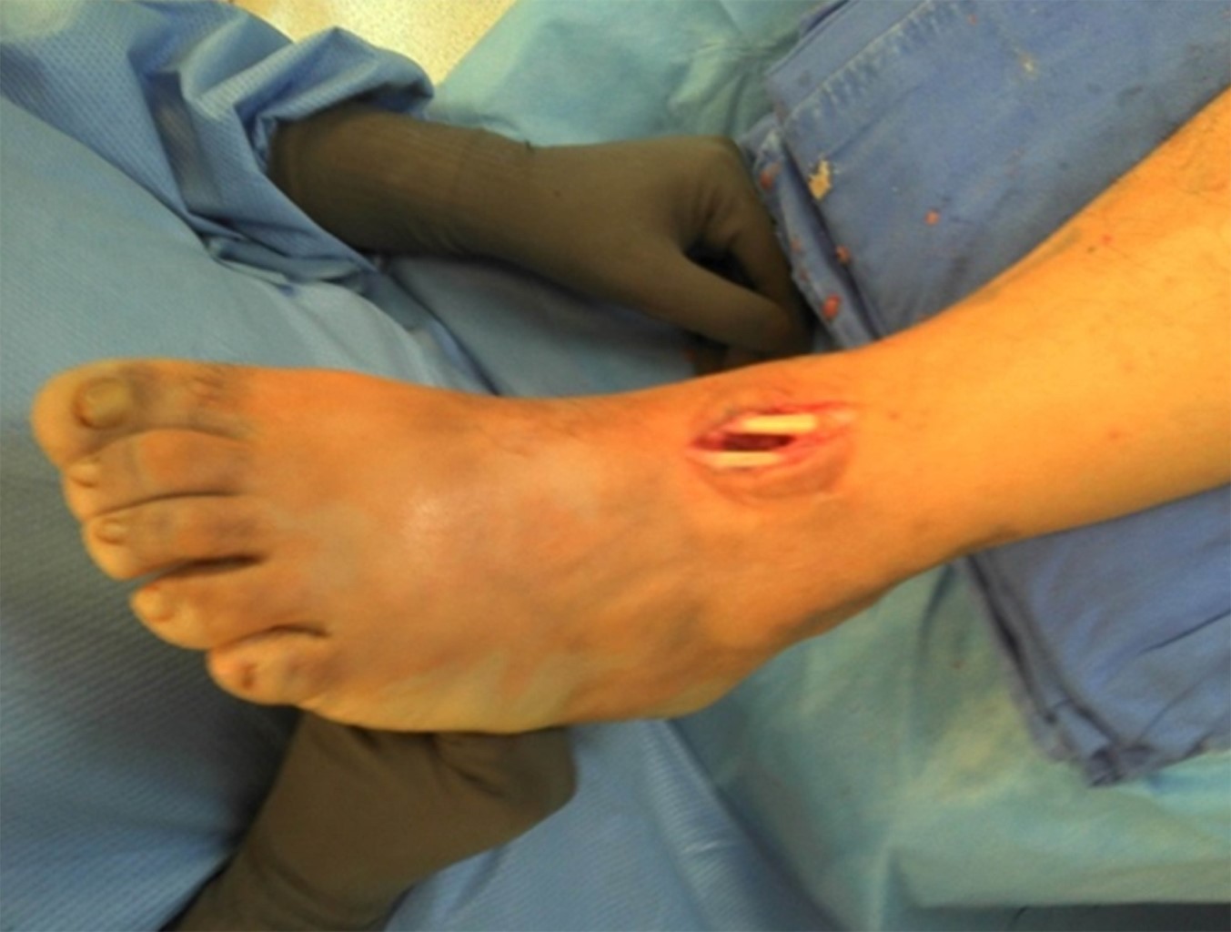 Se realiza un abordaje anterior de 2 a 3 cm a nivel de la articulación tibioastragalina del tobillo, se diseca por planos y se tiene que tomar como referencia el tendón del tibial anterior y el tendón extensor común de los dedos así como cuidar el paquete vascular y entrar entre ambos tendones (Figura 1); se realiza resección de hueso esclerótico con fresa mínima invasiva y se efectúan múltiples perforaciones para obtener un lecho sangrante conservando ambos maléolos.