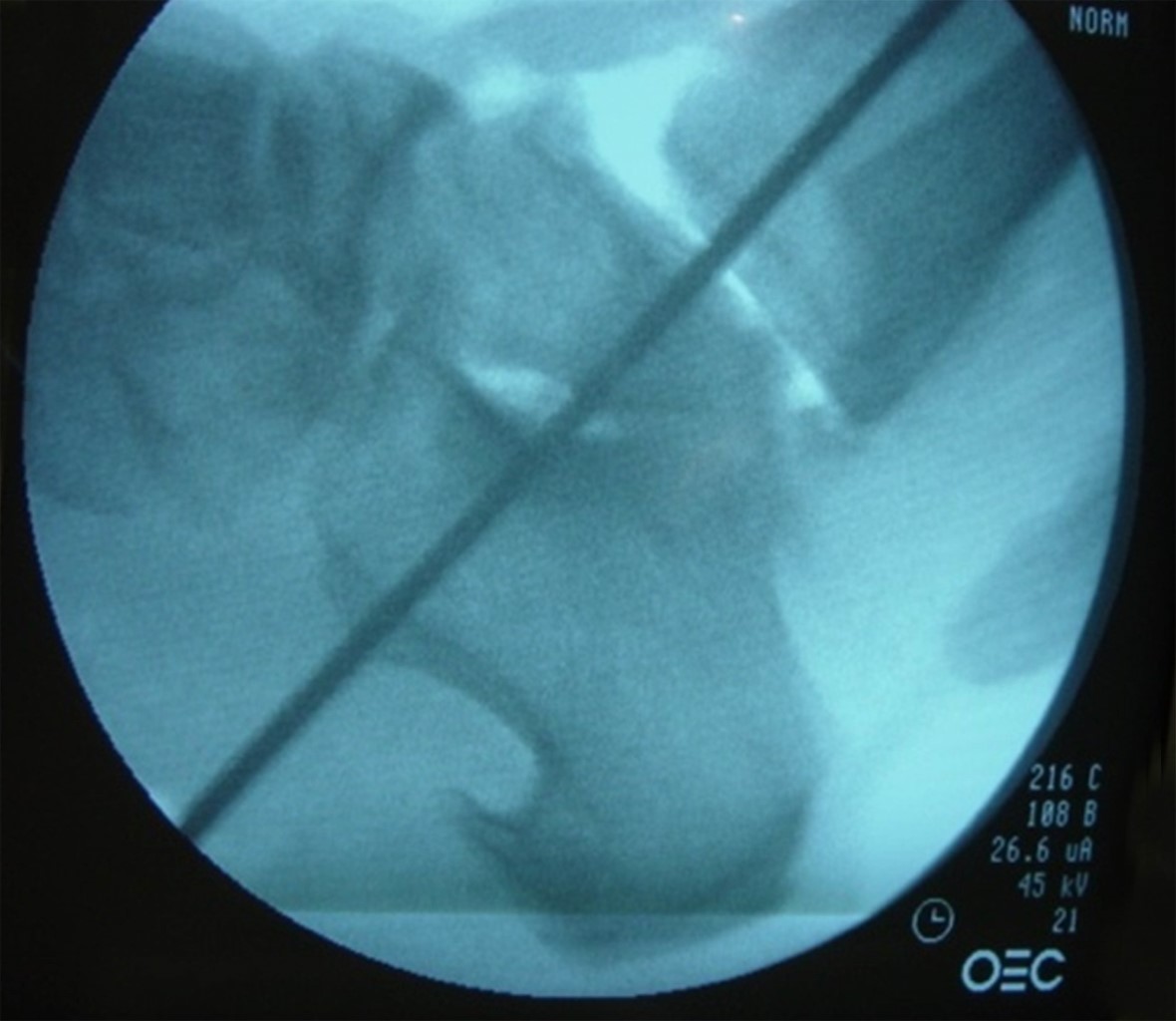 Posterior a la colocación del clavo, se verificó la posición y longitud con el intensificador de imágenes, se realizó el bloqueo posterior y después los bloqueos mediales, se verificó la posición de los mismos y se suturó por planos (Figura 3).