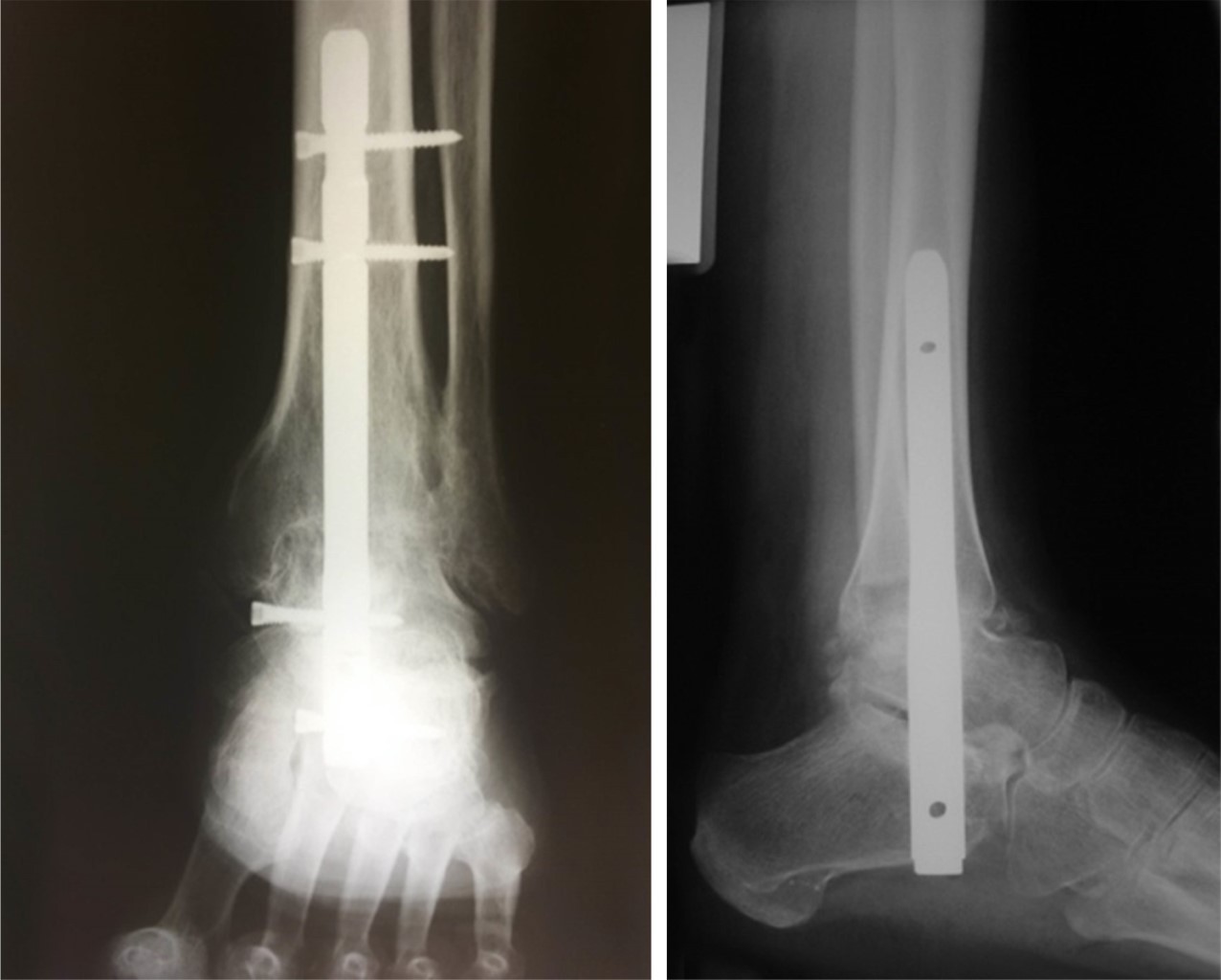 Existen muchas alternativas para la fijación de la articulación del tobillo; sin embargo, en diversos estudios el uso de clavos centromedulares ha demostrado mayor estabilidad rotacional, capacidad de generar compresión y de aumentar las tasas de fusión, especialmente en pacientes con mala calidad ósea.1-3