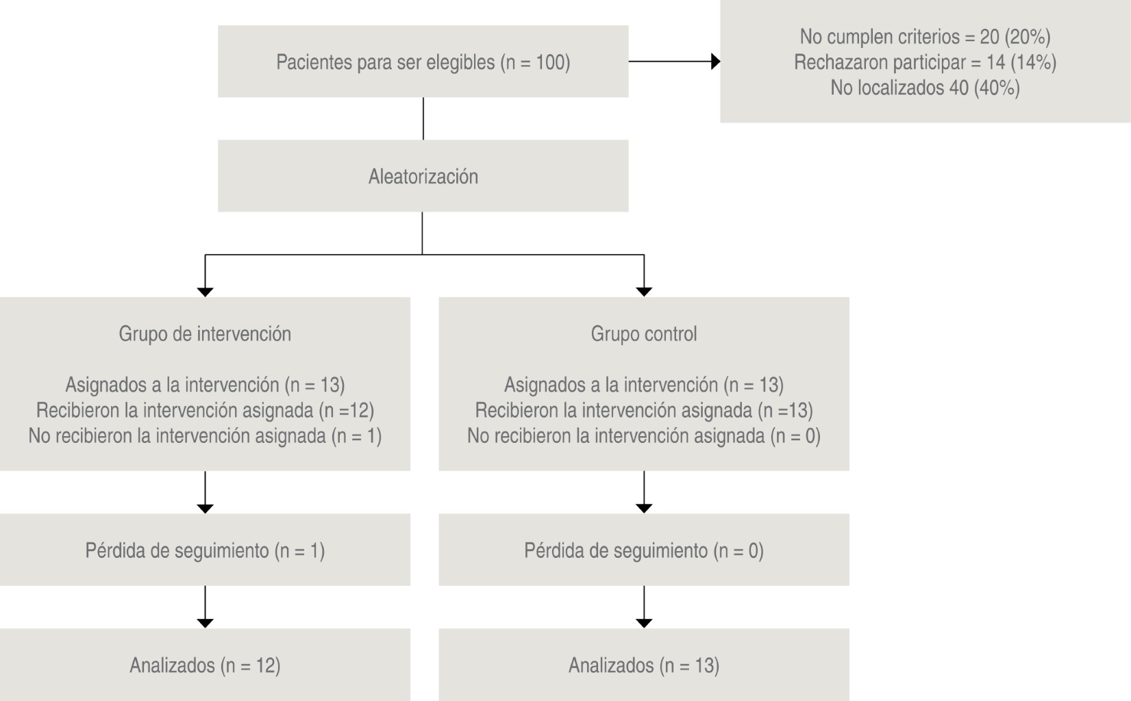 La población de la clínica con niños entre siete y 10 años fue de 121 niños. De ellos, 100 cumplieron los criterios de selección, 21 no cumplía porque no tuvieron ninguno de los factores de riesgo de diabetes tipo 2. Los elegibles que acudieron a la entrevista informativa junto con su padre, madre o cuidador primario fueron 26 niños. De los pacientes que no entraron al estudio, 20% (20) tenía prediabetes, 14% (14) no aceptó participar y el 40% (40) no se contactaron. Los 26 niños quedaron dentro del estudio cuando el padre, madre o tutor firmaron la carta de consentimiento informado y el niño el consentimiento. Cada grupo se conformó con 13 pacientes asignados de manera aleatoria. Durante el estudio, un paciente del grupo de intervención decidió abandonar el programa por cuestiones personales (Figura 1).