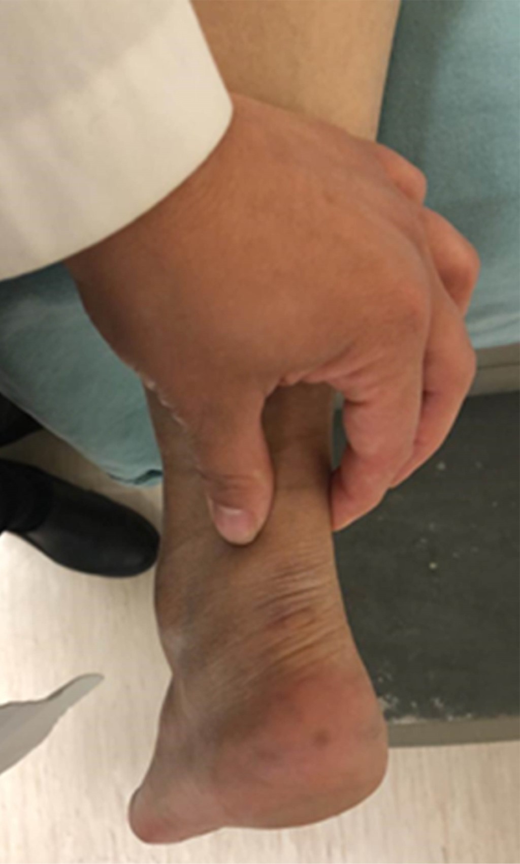 En nuestra valoración inicial encontramos a la exploración física dirigida, paciente neurológicamente íntegra con marcha bipodálica claudicante a expensas de miembro pélvico izquierdo de no más de cuatro pasos. La paciente acude en silla de ruedas. Se observa aumento de volumen a nivel del cuerpo del tendón de Aquiles, se palpa tumoración dura (Figura 1), dolorosa, no adherida a campos profundos, la cual se desplaza con la flexoextensión del tobillo. No encontramos cambios en la coloración, ni temperatura, arcos de movilidad de cadera y rodilla completos. A la exploración del tobillo observamos disminución de flexión plantar a 10o y dorsiflexión de 20o, ambos movimientos eran dolorosos. La fuerza por grupos musculares con incapacidad para pararse de puntas (Figura 2) a nivel de tríceps sural 3/5 escala Daniels, tibial anterior 5/5. La sensibilidad distal por dermatomos L1-S2 conservada. Los pulsos pedios y tibial posterior presentes de buena intensidad, llenado capilar distal dos segundos. Maniobras especiales para tendón de Aquiles Thompson presente, signo del hachazo negativo. Prueba del Royal London Hospital positiva (Figura 3). Se realiza escala AOFAS (por sus siglas en inglés de American Orthopaedic Foot and Ankle Society) de tobillo y retropié con puntuación de 23/100.