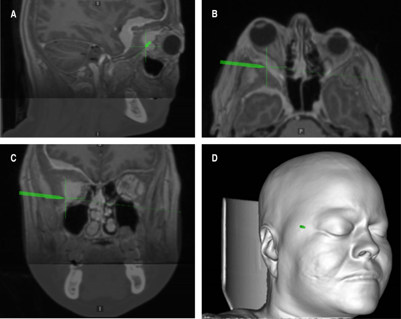 Los meningiomas esfeno-orbitarios constan de dos componentes: hiperostosis esfenoidal extensa y crecimiento intradural. La invasión dural a menudo se extiende hasta el ala esfenoidal basal, fisura orbitaria superior, canal óptico seno cavernoso, fosa infratemporal y estructuras periorbitarias. El presente trabajo tiene como objeto demostrar el manejo quirúrgico de estos pacientes con las ventajas de la neuronavegación y la reconstrucción 3D de la placa craneal con esterolitografía. Mujer de 46 años de edad con disminución progresiva de la agudeza visual de ojo derecho de un año de evolución, posteriormente se agrega disminución de la movilidad ocular y deformidad en el mismo ojo. En la resonancia magnética simple y contrastada de encéfalo se observa tumoración extraaxial dependiente del ala menor del esfenoides del lado derecho con extensión en placa a techo orbitario y fosa media, con componente tumoral intraorbitario extraconal que desplaza estructuras intraoculares, compatible con meningioma esfeno-orbitario derecho. Se realiza craniectomía frontotemporal con osteotomía órbito-cigomática derecha, descompresión de hendidura esfenoidal y agujero óptico, guiada por neuronavegación (Simpson I), ulteriormente se realizó reconstrucción de defecto craneal con placa preformada en 3D de metilmetacrilato. El meningioma esfeno-orbitario es un tumor raro de la base del cráneo con crecimiento intraóseo e hiperostosis que clínicamente en la mayoría de los casos se manifiesta con proptosis, discapacidad visual. Es de importancia la resección tumoral agresiva con el fin de evitar recidiva tumoral y mejorar el pronóstico a largo plazo.INTRODUCCIóN