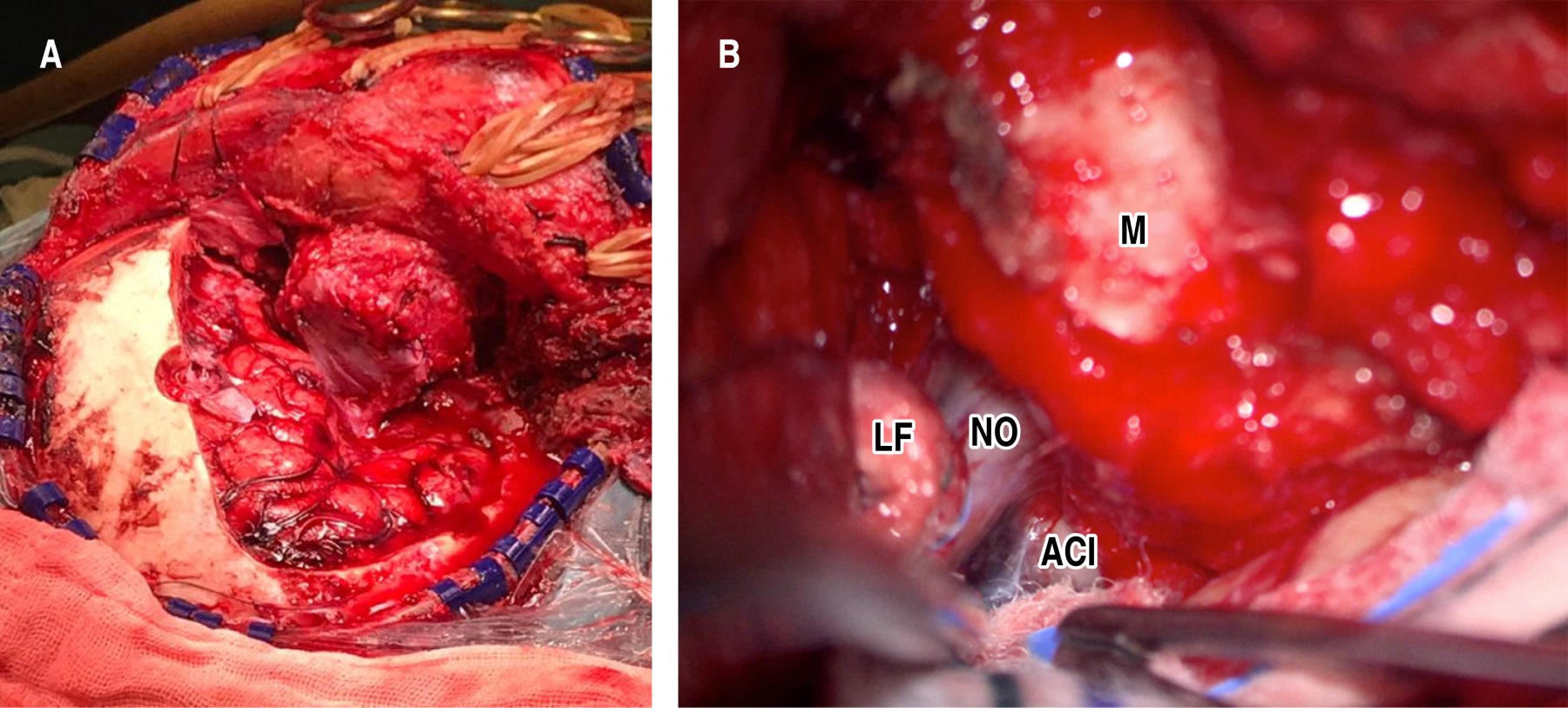 Se realiza incisión pterional ampliada, craniectomía frontotemporal con osteotomía órbito-cigomática derecha, descompresión de hendidura esfenoidal y agujero óptico, guiada por neuronavegación, resección de implante dural con componente tumoral óseo frontoorbitario (Simpson I) y descompresión orbitaria extraconal con plastia dural (Figuras 2 y 3).