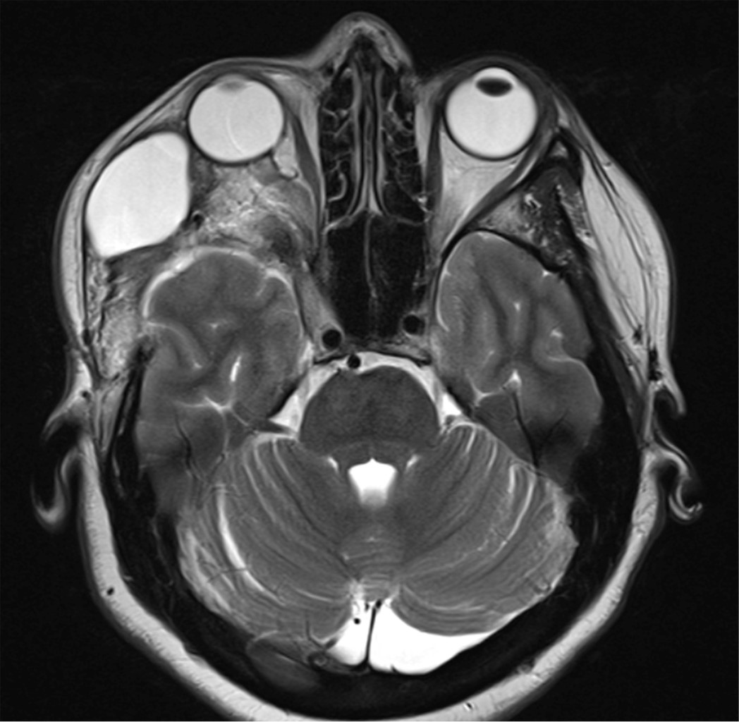 Mujer de 46 años de edad presenta disminución progresiva de la agudeza visual de ojo derecho de un año de evolución, posteriormente se agrega disminución de la movilidad ocular y deformidad del mismo ojo. A la exploración neurológica con proptosis y disminución de la agudeza visual de ojo derecho, solamente detecta bultos, no distingue colores, con paresia de músculos extraoculares de predominio recto superior con supraversión limitada de ojo derecho, reflejos fotomotor y consensual disminuidos del lado derecho, sin compromiso de la fuerza y sensibilidad.