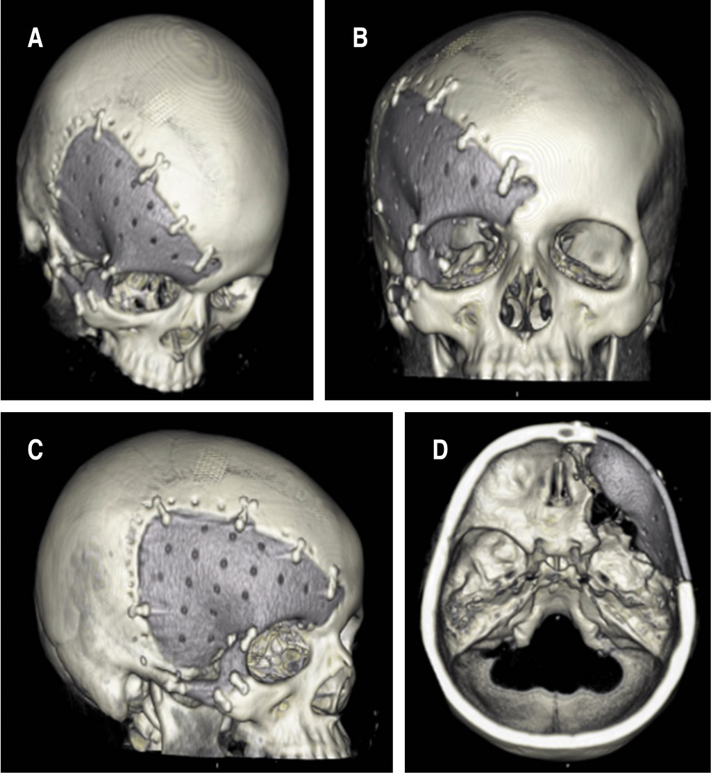 Posterior a cirugía se realiza resonancia magnética simple y contrastada de control sin evidencia de tumor residual, por lo que no ameritó radioterapia adyuvante, manteniéndose en vigilancia estrecha y libre de actividad tumoral a dos años de seguimiento y se lleva a cabo reconstrucción de defecto craneal con placa preformada en 3D de metilmetacrilato (Figura 4).