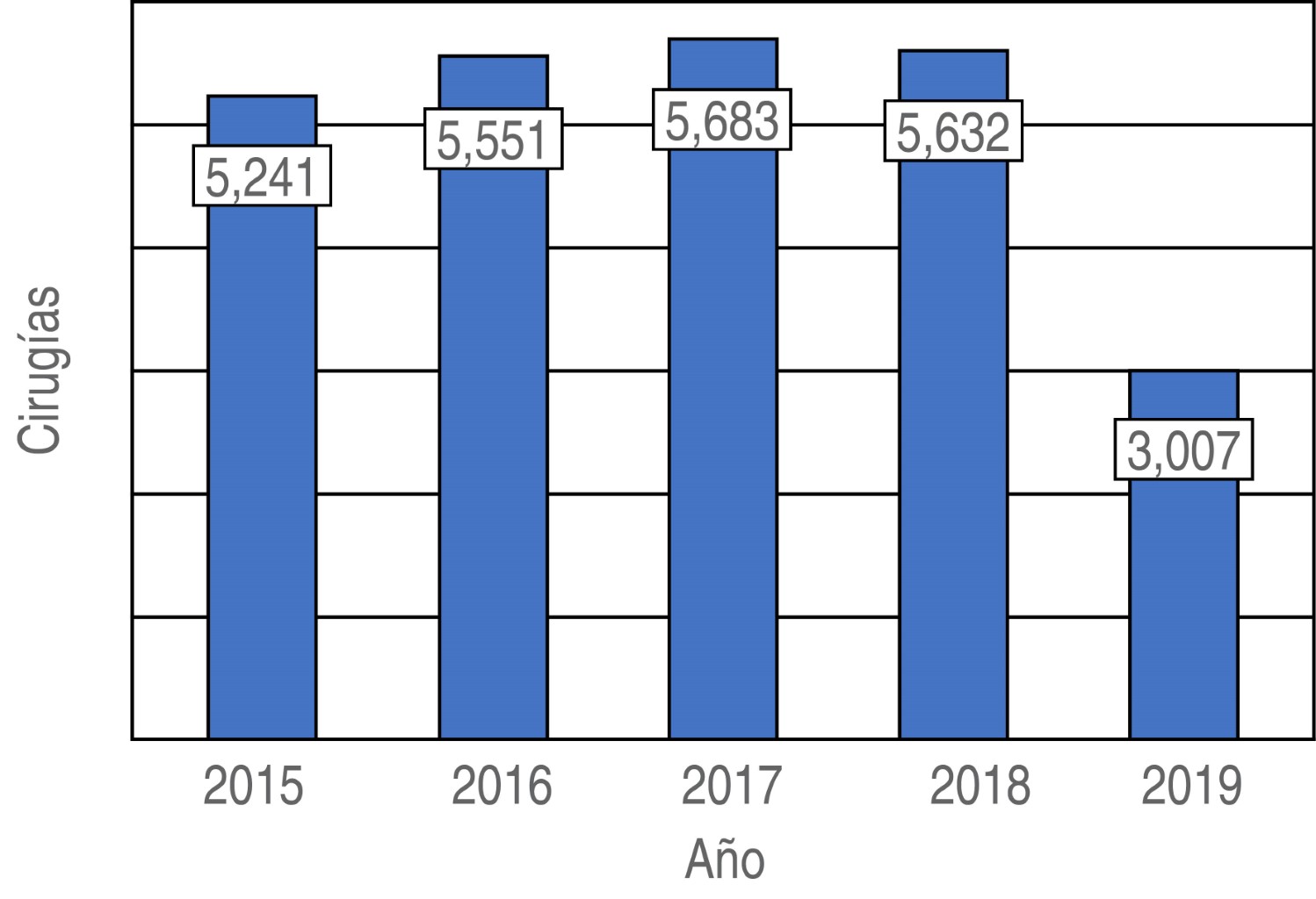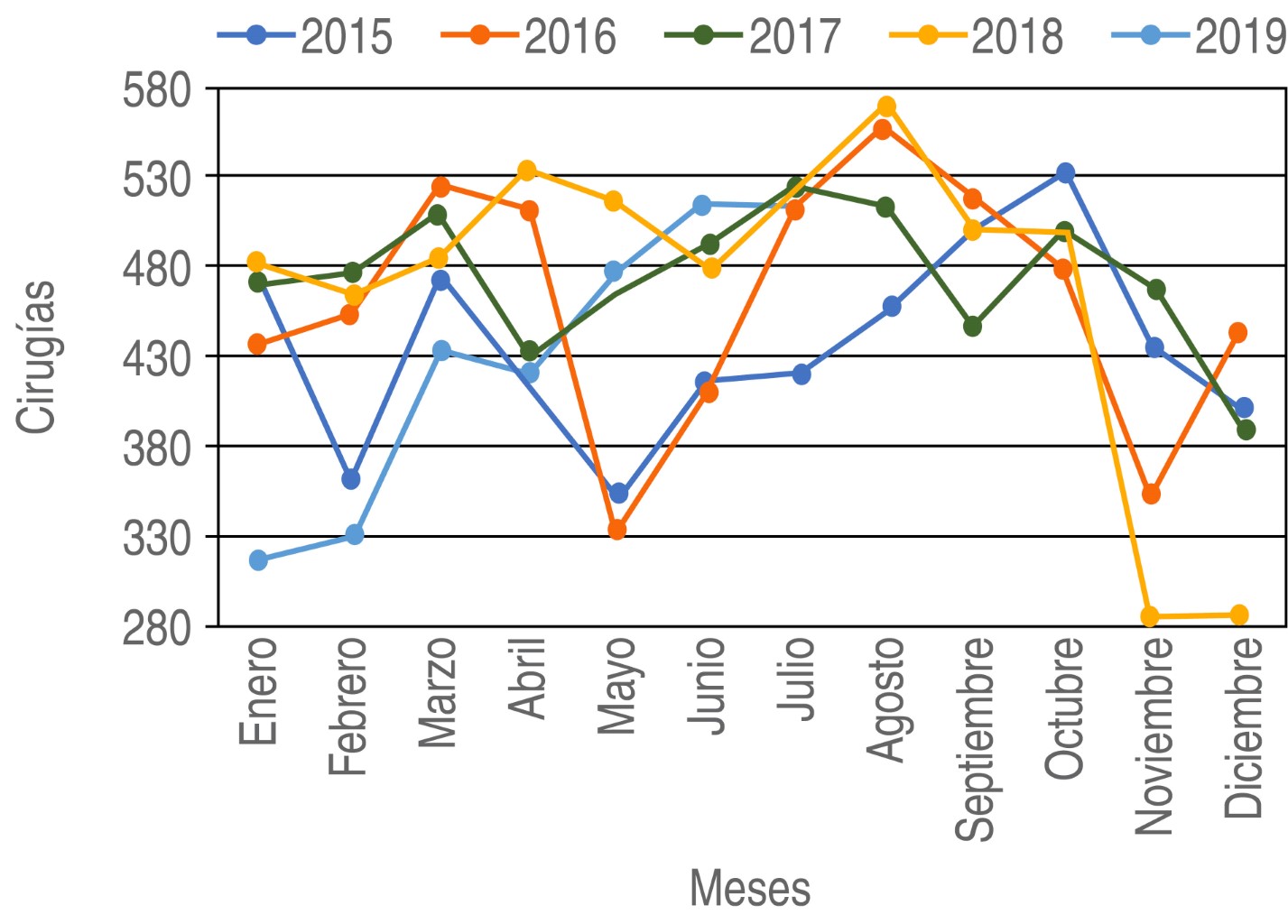 Durante el período de tiempo comprendido por el estudio (01 de enero de 2015 a 31 de julio de 2019), el año en el que se realizaron un mayor número de cirugías fue 2017, con un total de 5,683 cirugías, y el año en el que menos procedimientos se registraron fue 2019 con 3,007 cirugías debido a que sólo se registraron los procedimientos de enero a julio de 2019 (Figura 1). El promedio de cirugías anuales fue de 5,527 procedimientos. La mediana de cirugías diarias fue de 16 procedimientos, con un rango de 2-25, siendo los fines de semana los días con un menor número de procedimientos realizados. La mediana de cirugías mensuales fue de 437, con un rango de 287 a 573 procedimientos mensuales.