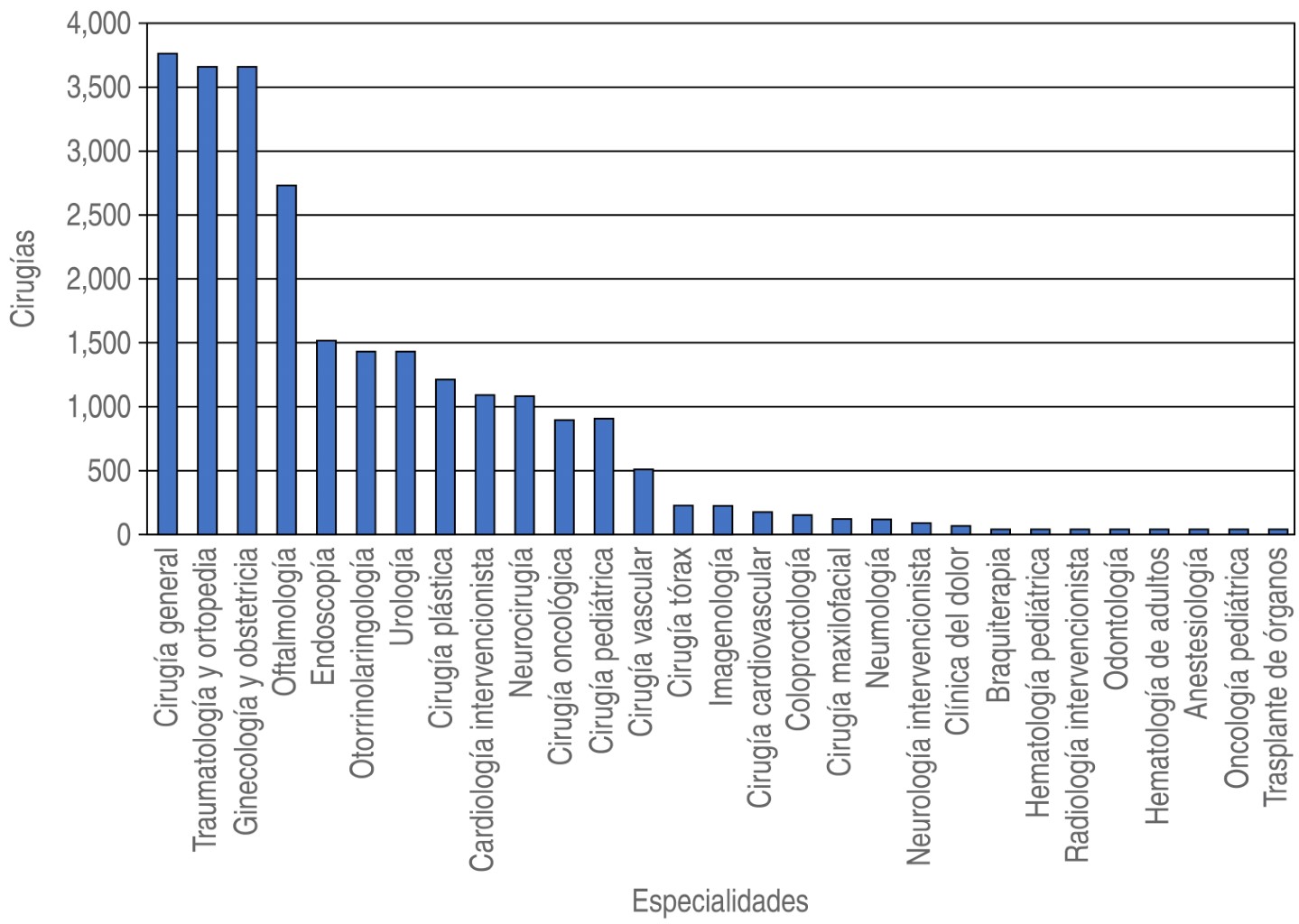 Las especialidades con mayor número de cirugías realizadas fueron cirugía general, traumatología y ortopedia, ginecología y obstetricia, oftalmología, endoscopía, otorrinolaringología, urología, cirugía plástica, cardiología intervencionista y neurocirugía. Por el contrario, las especialidades con el menor número de procedimientos fueron trasplante de órganos, oncología pediátrica, anestesiología, hematología de adultos y odontología. Esto se puede observar en la Figura 3.