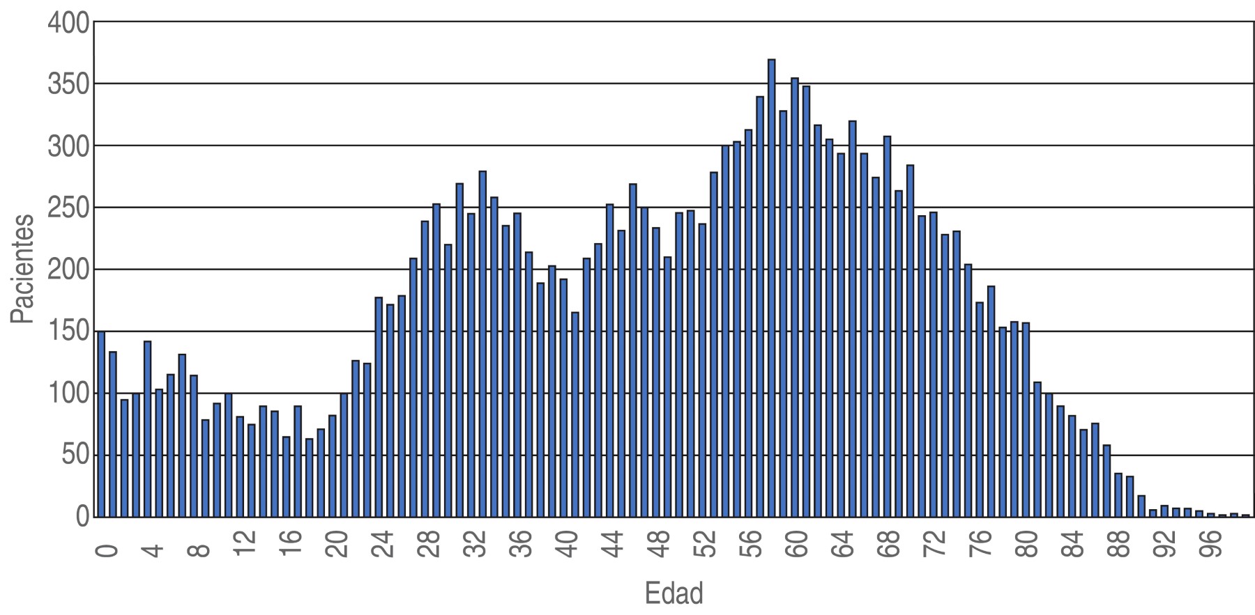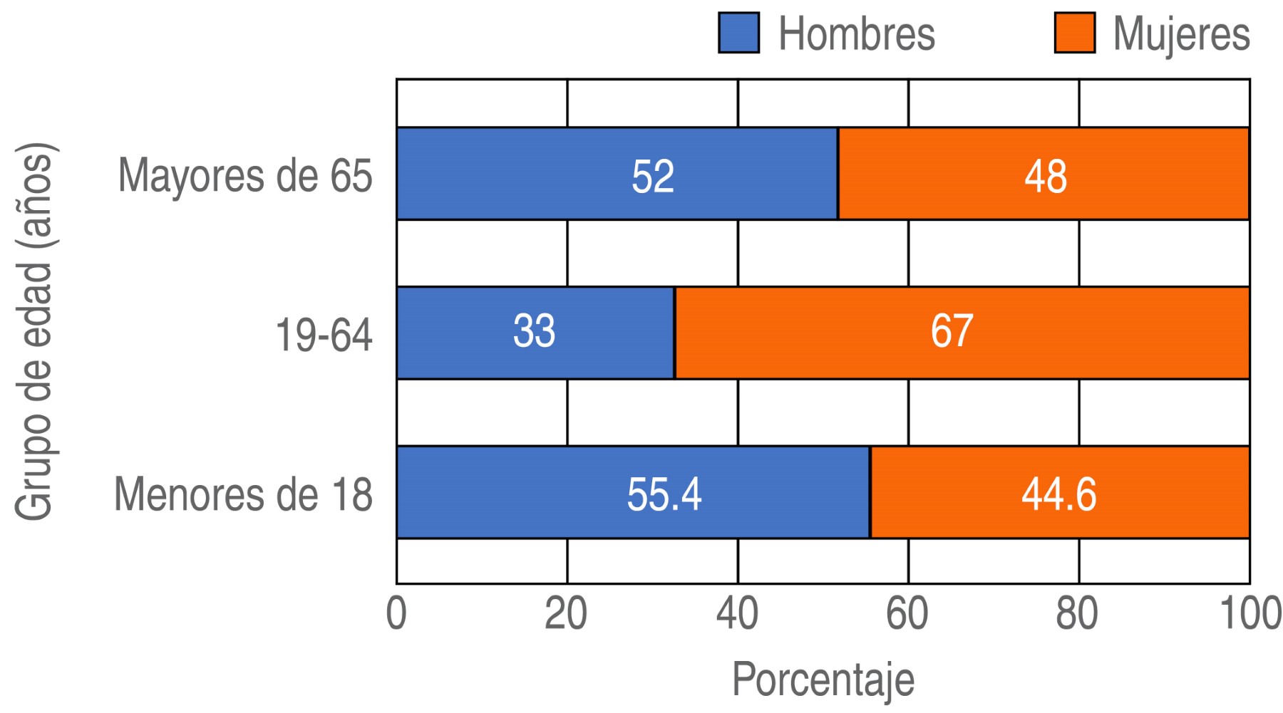 En menores de 18 años el 55.4% fueron hombres y el 44.6% mujeres. En el grupo de edad comprendido entre los 18 y 64 años hubo más pacientes mujeres (67%) que hombres (33%). En mayores de 65 años nuevamente vuelve a haber una proporción similar de hombres y de mujeres (52 y 48% respectivamente), esto puede observarse en la Figura 4.